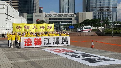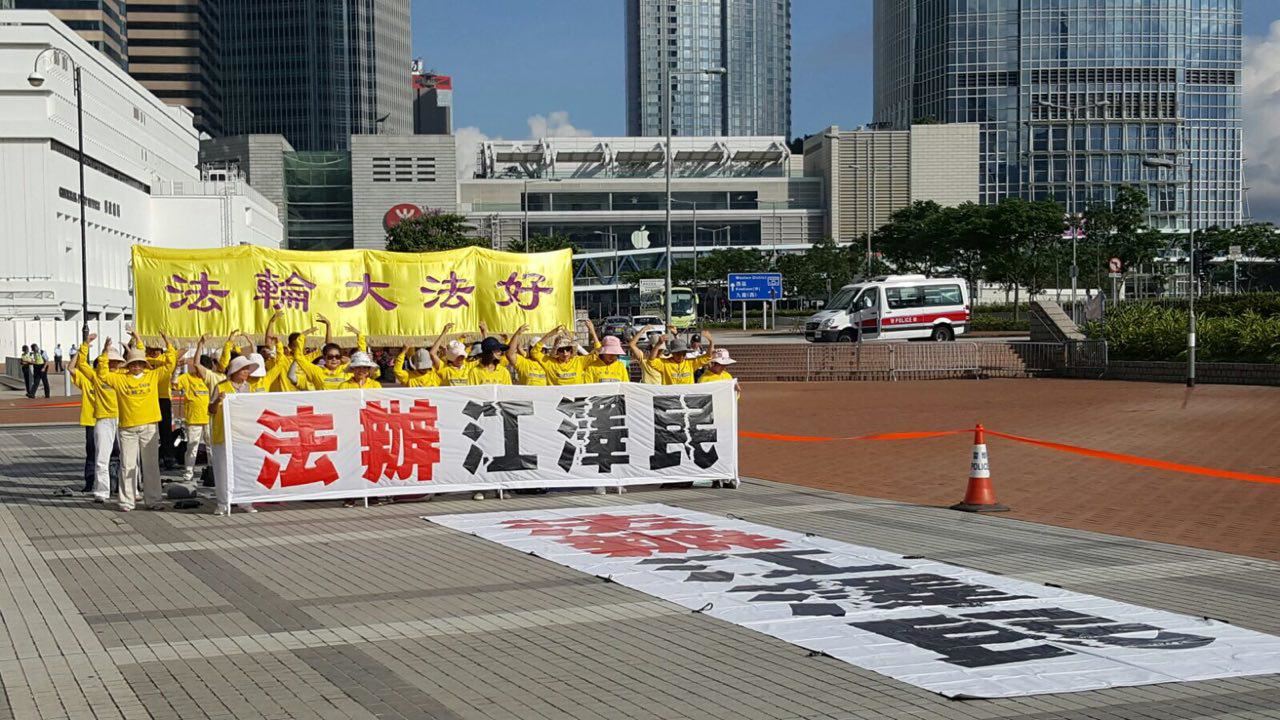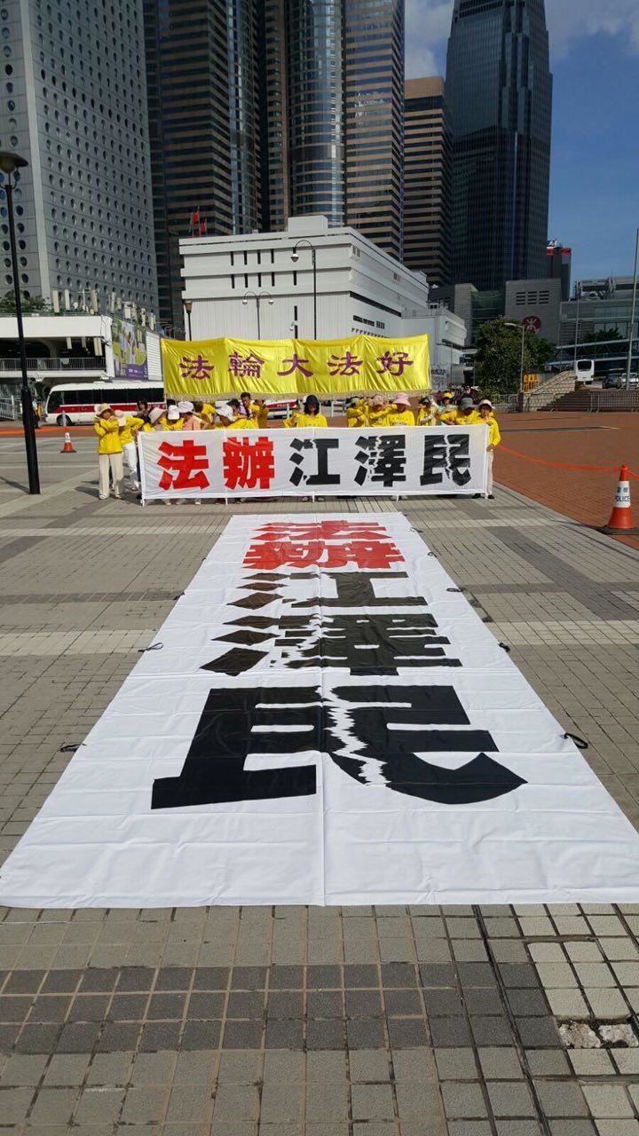 习*近*平访港的第二天,三十日一早,数十名身穿黄上衣白长裤的香港法轮功学员,聚集在中环爱丁堡广场炼功,正面遥对着习*近*平住宿的海景万丽酒店方向,打出“法办江泽民”的巨型横幅,再次呼吁停止迫害,法办江泽民。