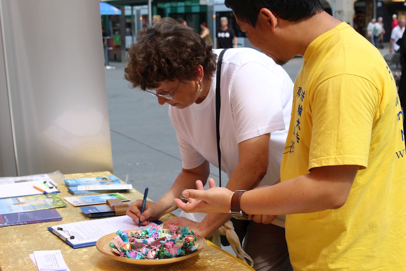 一位瑞士的女游客也被中共残酷迫害法轮功学员的暴行所震惊,立即签证,希望帮助停止迫害。