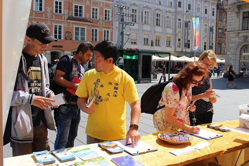 法轮功学员本次活动也是奥地利纪念法轮功反迫害十八周年的系列城市之一。当天活动的广场上,到处是穿着黄色体恤衫的法轮功学员的身影。学员的功法吸引着本地民众和游客前来了解真相。并对中国残酷活摘法轮功学员器官进行非法交易的罪行表示愤慨。还有的民众对法轮功的性命双修功法非常感兴趣。并对学员祥和的能量场表示出惊喜。