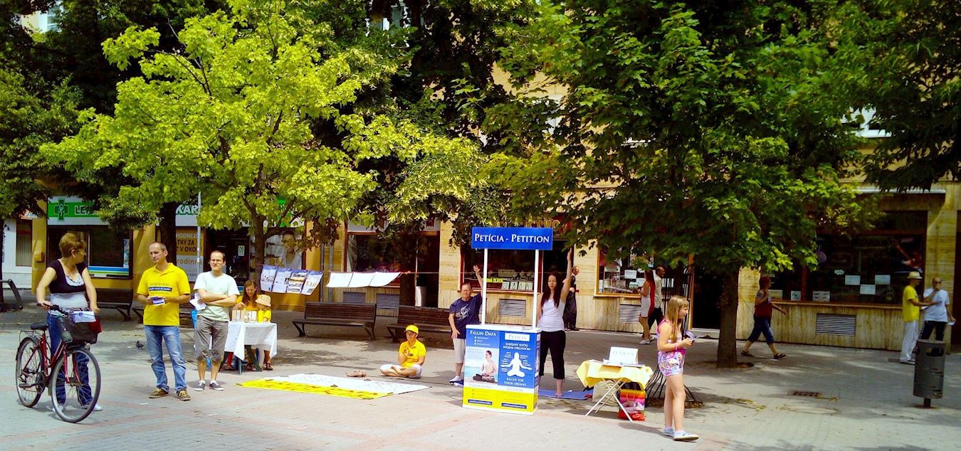 二零一七年七月七日斯洛伐克部份法轮功学员在Nové Zámky市中心广场的一角,拉开真相横幅,有的随着舒缓的炼功音乐演示一至五套功法,有的在给过往路人讲述法轮功在中国大陆被迫害的真相,有的在散发真相传单。当地的斯洛伐克人和不少匈牙利族裔的人路过时,几乎都接过学员手中的真相传单,了解法轮功真相后,纷纷来到征签台前签名表示反对迫害,反对强行活摘法轮功学员器官。