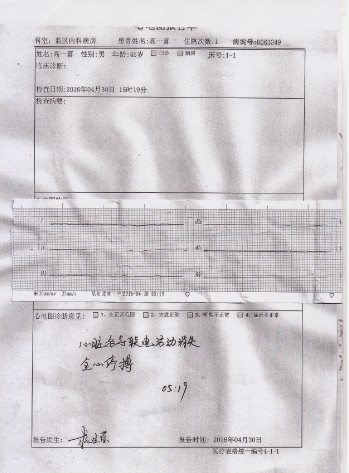 四月二十九日一早,医生窦香芝对高一喜再次进行查体,记录为:神清语明,颈软,心律68次/分,节律齐,音纯,无杂音。(见下图)