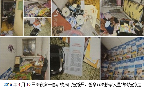 二零一六年四月十九日晚十点多钟,高一喜租住的房门外传来了连续不断的撬门声,半个小时后,四个带着白手套的着装警察破门入室,强控高一喜夫妇不准动。在没有出示任何证件的情况下,开始搜查家中所有物品。徒然,恐怖气氛笼罩着这个原本温馨的家。