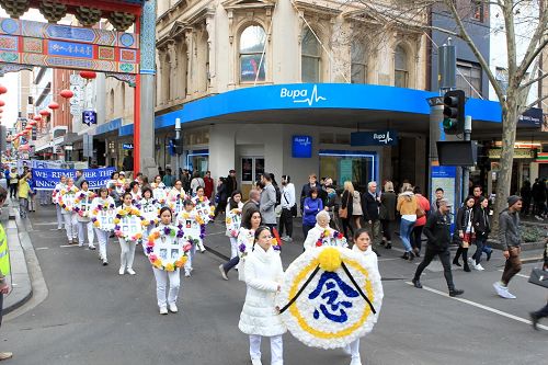 游行从墨尔本市中心的Alexandra Gardens出发,队伍由身着蓝衣白裤的天国乐团引领,嘹亮的军乐声让市民和游人纷纷驻足。紧跟在天国乐团后面的是三个方阵。第一方阵主题为“法轮功好”,展示了巨型法轮功书籍、花车。身着黄色炼功服的法轮功学员还向民众演示了优美、祥和的功法。