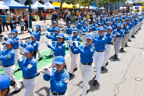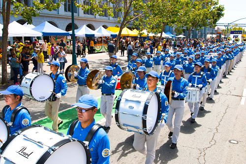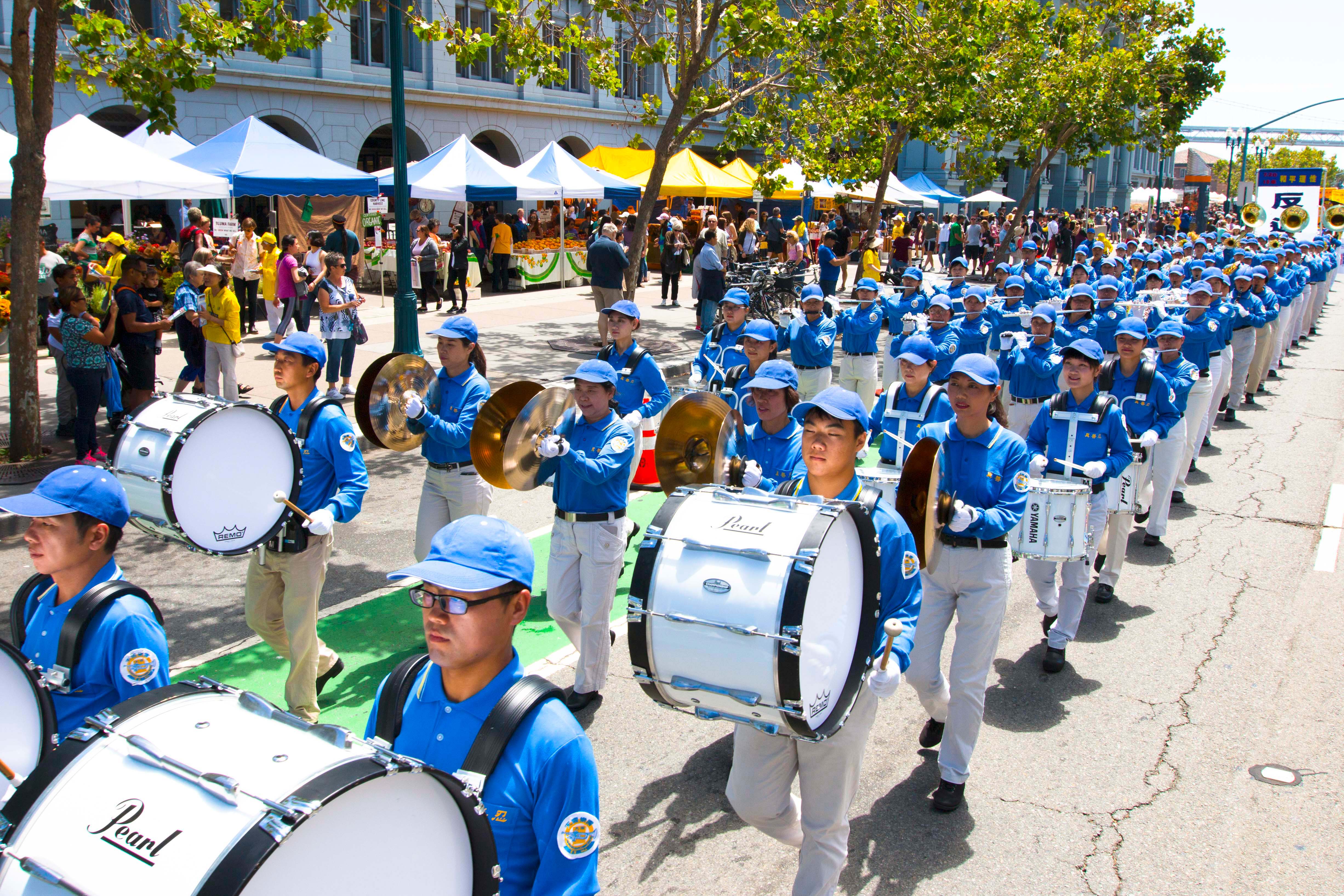 游行队伍由四个方阵组成:第一方阵是法轮大法好,由美西天国乐团、橫幅队和炼功队组成;第二方阵是停止迫害法轮功。由身穿白色服装的学员手持被迫害致死同修的遗像,和要求制止中共法西斯暴行等横幅队组成;第三方阵是全球起诉江泽民。法轮功学员举着展版向人们展示江泽民的罪行。第四方阵是·九·评*、退!党!方阵。他们举着声援二亿七千八百万中国人三:退.的横幅和展板,呼吁民众赶快退出中共的邪恶组织。