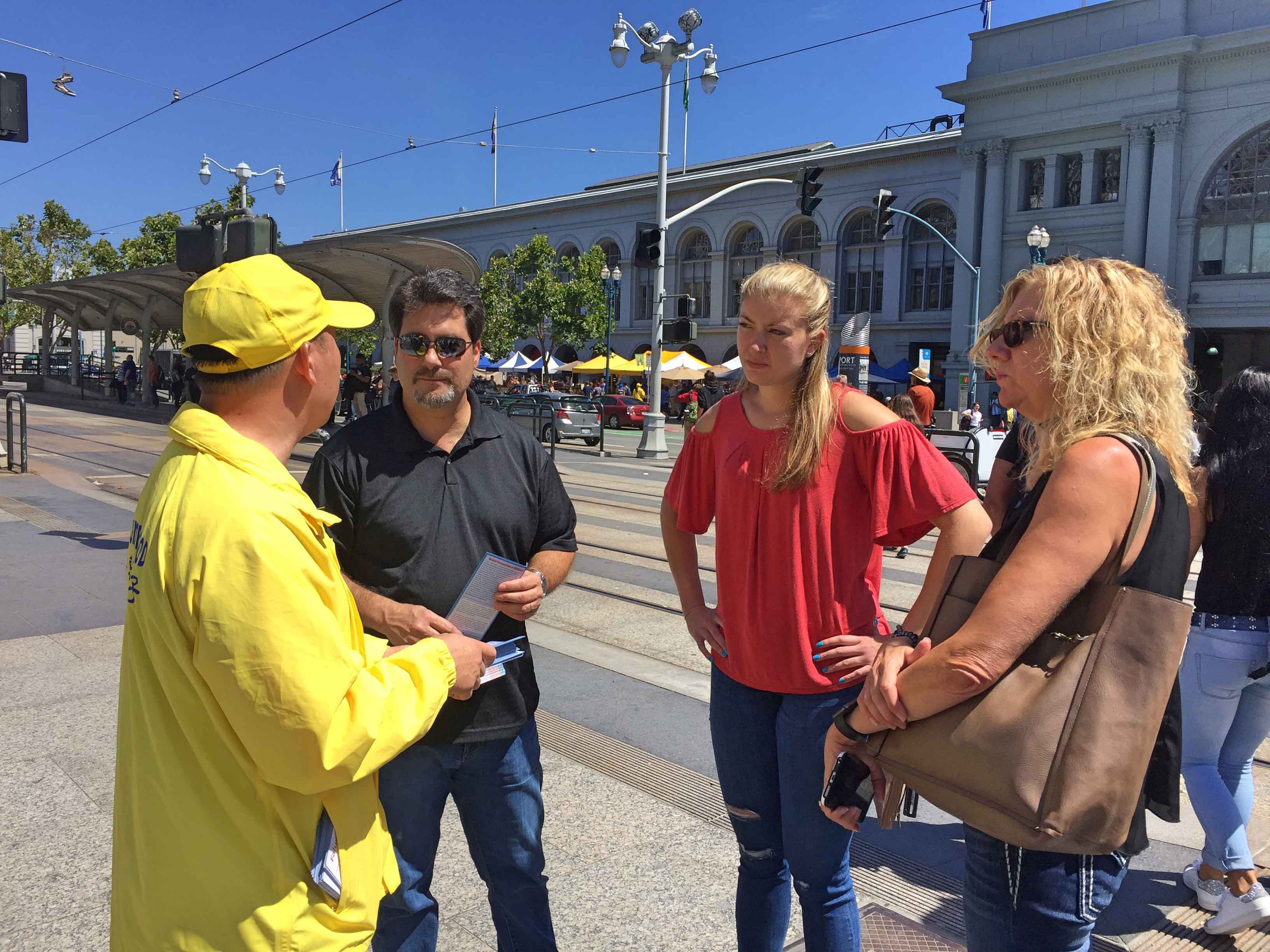 Marifa Perez和先生Fabio来旧金山度假,恰好经过法轮功学员的活动现场,当了解到法轮功学员因不放弃修炼而遭受迫害,同时也得知邪恶中共活摘法轮功学员器官,他们感到非常的愤怒和难过。Marifa表示,没有人有权力去限制或强迫任何人放弃自己的信仰。况且,我知道打坐是对人健康有益的方式,更不应该被限制,甚至遭到迫害。我们应该让更多人了解这些事情,同时也要让中共知道,它们应该遵循创世主的意志。