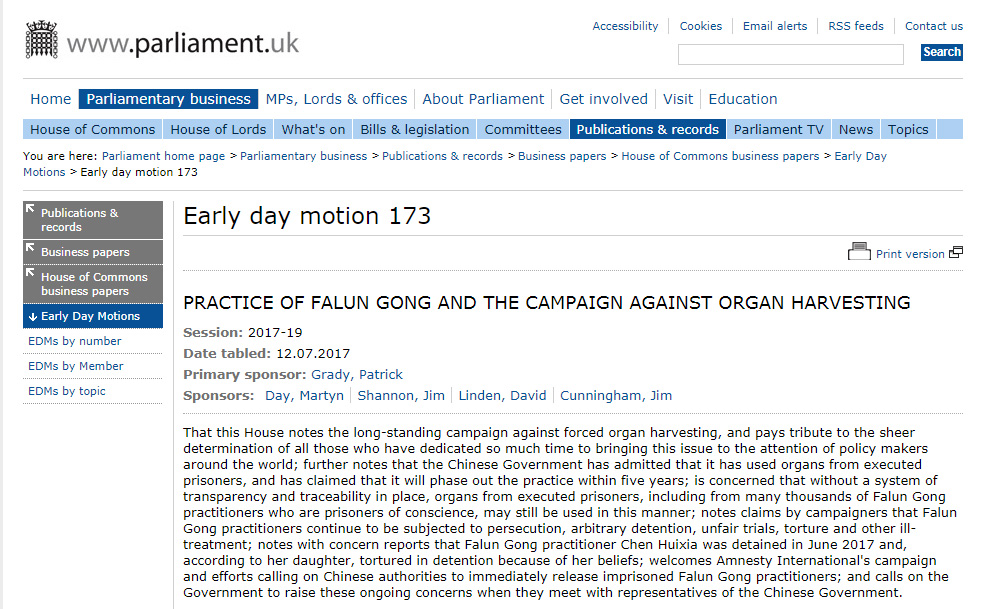 ![]() 英国议会大厦网站截图:“法轮功修炼与反(中共)‘活摘’行动(PRACTICE OF FALUN GONG AND THE CAMPAIGN AGAINST ORGAN HARVESTING)”―173早期动议案(Early day motion 173) |