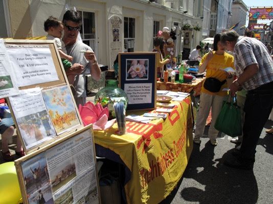 每年艺术节期间,法轮功学员都在马泽日(Mazey Day,星期六主题游行)和码头日(周日市场)两天设置展位。学员教人们制作折纸莲花、演示功法,并把当地的炼功点信息介绍给感兴趣的人。展位上还设置真相展板帮助人们了解中共对法轮大法的残酷迫害,并呼吁人们签名反迫害。今年法轮功学员特别呼吁民众在反“活摘”请愿书上签名,呼吁制止中共大规模强制摘取法轮功学员器官贩卖牟利的罪行。