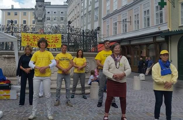 当天活动在萨尔斯堡市中心老城举行,正值旅游旺季,法轮功学员的活动吸引了来自世界各地的游客和当地民众。人们对中共活摘法轮功学员器官的暴行感到震惊和气愤,并在反迫害的征签表格上签字,以帮助制止这场持续了十八年的浩劫。