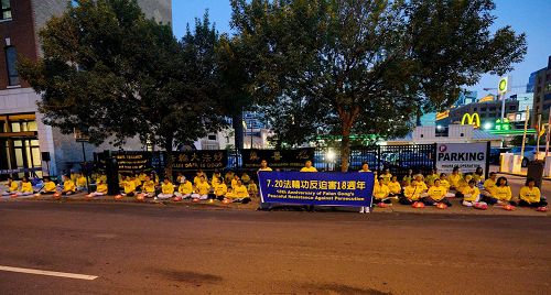 当天下午,法轮功学员在芝加哥中领馆对面的街道上集体炼功。舒缓的音乐飘过几个街区之外,黄色的炼功服在夕阳下格外引人注目,很多路人驻足,详细了解法轮功及其在中国无辜遭迫害的真相。随后,法轮功学员代表在集会上发言,呼吁国际社会制止中共暴行。