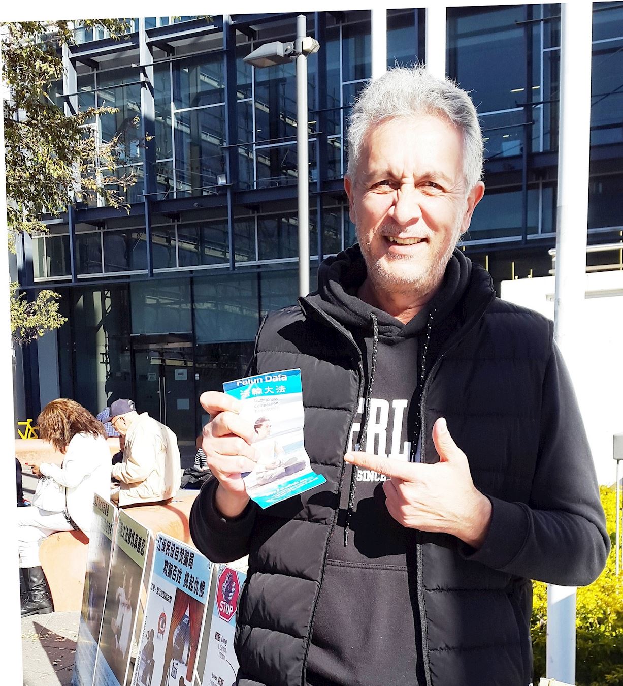二零一七年七月十六日中午,在华人聚集地区艾士菲(Ashfield) 真相摊位前,一位经常打坐修行的土耳其男士阿斯兰先生(Zeynel Arslan)签名支持反迫害后,他表示:“我不喜欢共产主义,它给世界带来负面因素!中国共产党迫害法轮功,和活摘法轮功学员器官是不人道和不公正的!而法轮功学员按照真、善、忍原则修炼,不但能自己健身、纯净灵魂,更重要的是法轮功能帮助人变得祥和、平静,把世界变得更美好。所以我希望人们都来了解法轮功在为世界贡献什么?”
