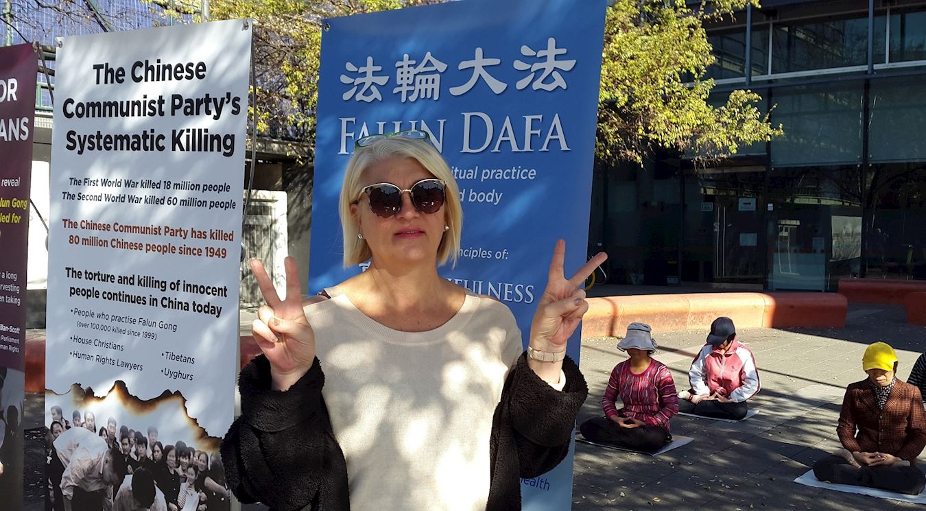 从事儿童教育工作的卡内维尔女士(Louise Carnevale)在一旁静静地感受法轮功学员正在炼功的能量场后表示:“我也想加入他们修炼,可是很可惜,如果他们在中国炼法轮功就会被(中共)带走,并被剥夺他们的基本人权。我非常难受……(带着哭音继续说:)我感到这是罪恶、不人性的行径。我记得以前法轮功学员也在街上告诉过我这些事。我希望他们能拥有我们一样的人权和信仰自由。他们只是自我健身、做好人,找回内心的祥和、美好,又不损害国家任何利益。这是我们每个人都需要的!如果有更多的人象法轮功学员那样遵守真、善、忍原则修炼自我,那么这个世界将变得更加和平、美好,世界将没有战争!”卡内维尔女士已经签名支持反迫害多次了,这次她详尽的询问、记载了离她居住地最近的法轮功晨炼点的地址和时间,希望自己能加入他们一起修炼。