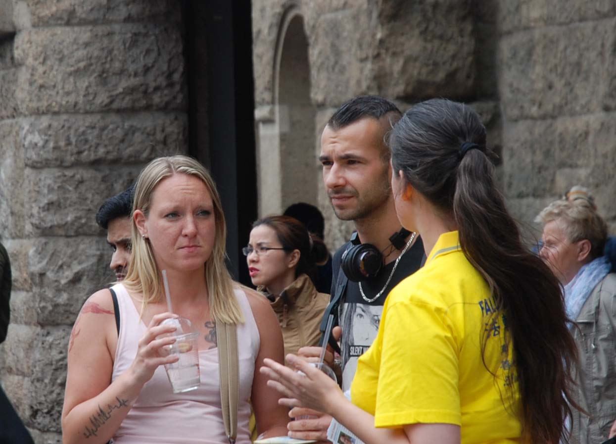 在市政厅外游客居多,法轮功学员马上转为用英语向他们问好,告诉他们这是怎样的一个团体,他们为什么来。一个25岁左右的中国女学生和她的男朋友睁大眼睛,被乐团吸引。女学生脸上放光,告诉法轮功学员说:“这个(法轮功)我知道,我觉得法轮功挺好的。”当学员递给她一朵小莲花时,她开心地笑了,连声道谢。