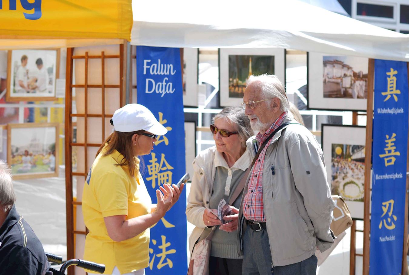 Nicole四十出头,来自Harburg,她周五的时候已经拿到了一个真相传单,可惜没有看见天国乐团。她是天主教徒,在展位上和一个女学员聊了很久,她觉得法轮大法的理念非常好,并说第二天一定要来看乐团游行。周六时她果真来到游行地点看到了天国乐团,撞见那同一个学员,她非常兴奋,说:“乐团的传统服饰太美了,乐曲令人享受并且心情愉快。我一路跟着乐团,看见很多路边的人和我一样高兴。他们还问我呢,说‘这是什么团体’,我可以告诉他们一些,因为我昨天已经看过你们的传单了。”
