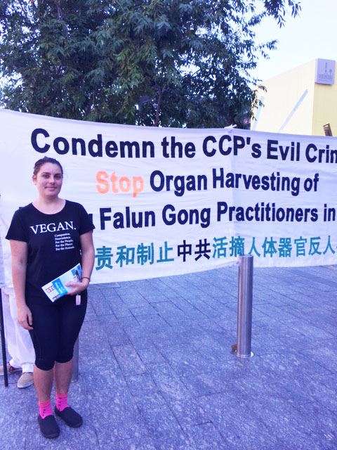 意大利留学生莎莉(Chiara)最近才来澳洲留学,她和朋友在广场了解到法轮功受迫害的情况,特别是活摘器官的罪行,感到非常震惊。她说:“迫害太残酷了,是不能容忍的。我们也有信仰,我们支持人权,支持你们反迫害。”