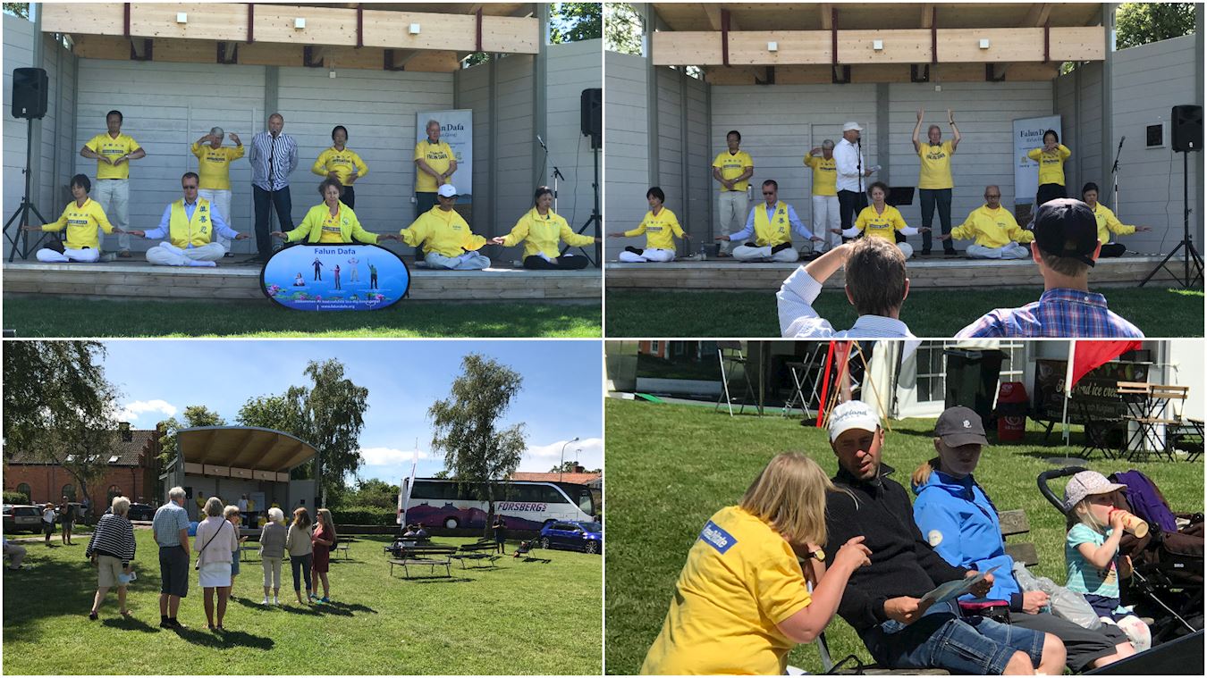 法轮功学员也在这热闹的庆祝活动中搭起了帐篷,为瑞典民众介绍法轮大法,并现场展示功法,义务教功,受到当地民众的欢迎。