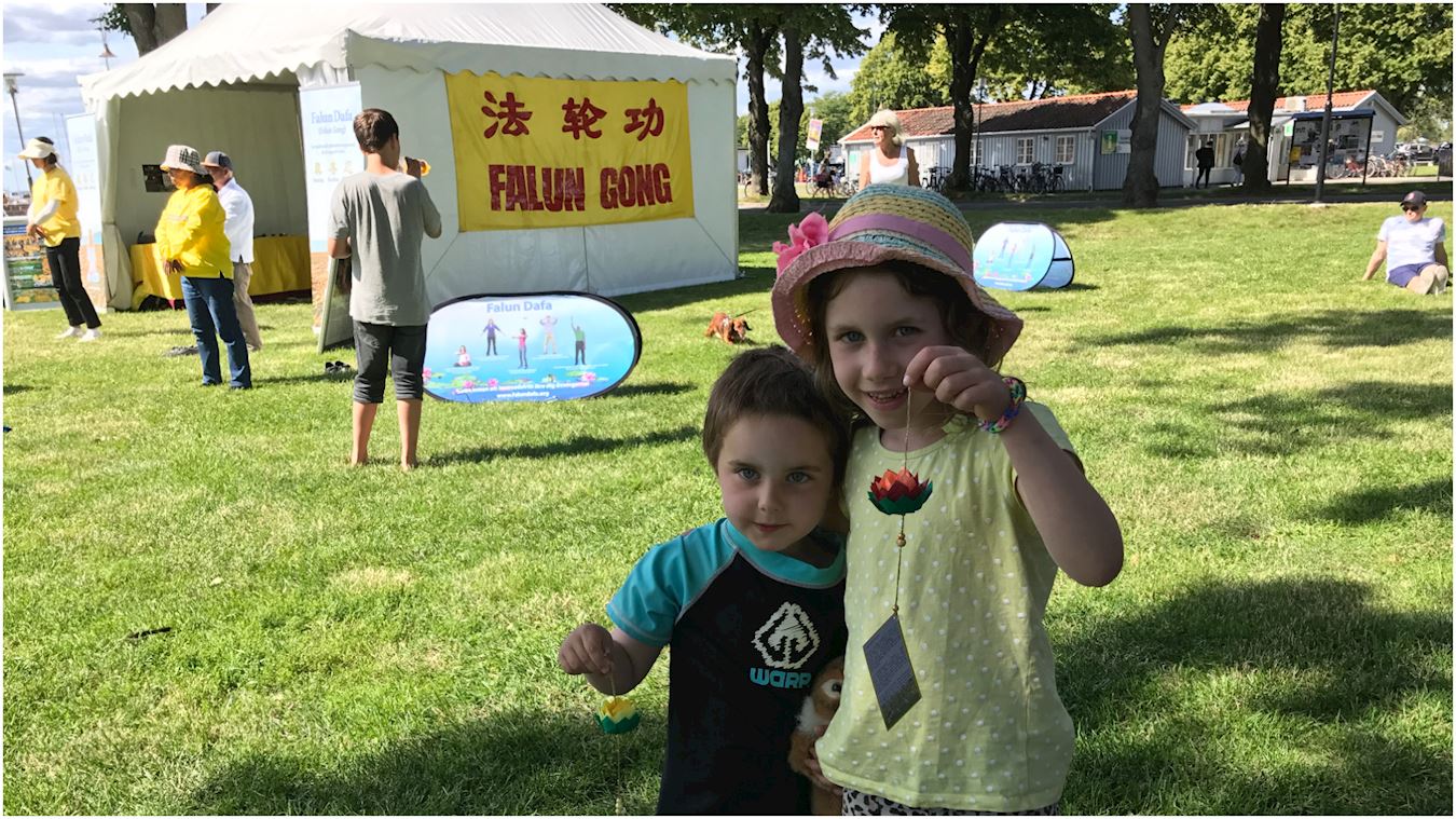 两个瑞典儿童来到法轮功展位,男孩大约四岁,女孩大约六岁,他们兴致勃勃地站在那里看法轮功学员炼功,非常可爱。学员走上前去送给两个小孩每人一朵莲花。小女孩接过莲花后问道:“我应该把它放到哪里最好?”法轮功学员回答:“可以把它挂在你的房间里,每天都可以看到它。”女孩高兴地点点头。