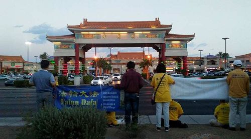 拉斯维加斯中国城位于华人集中的春山路段,法轮功学员在这里展示“纪念7.20 呼吁制止迫害”、“法轮大法好”、“退出中共党团队自救保平安”等横幅。和平悼念捍卫“真、善、忍”信仰而失去生命的法轮功学员。