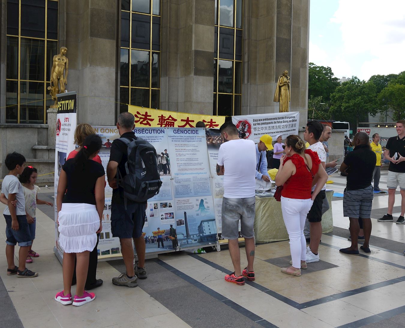 小学教师格雷戈尔(Grégoire )刚在人权广场旁边的人类博物馆看过有关种族、人性及反人类罪行的展览,出来又得知在中国发生的对法轮功的迫害,他说:“我感到震惊。那些统治者在迫害人民,贩卖人体器官,牟取暴利,必须要揭露他们,让世人都知道,制止这场迫害。为了人道的理由,我和你们站在一起。”