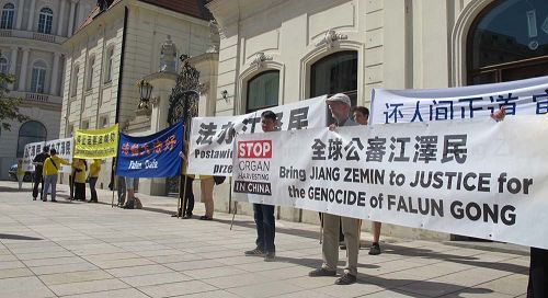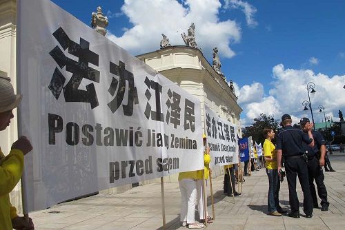 张德江到访的第二天上午,华沙风雨交加,法轮功学员一大早就在华沙议会大楼外打出条幅:“法轮大法好”、审判江泽民 还人间正道”。
