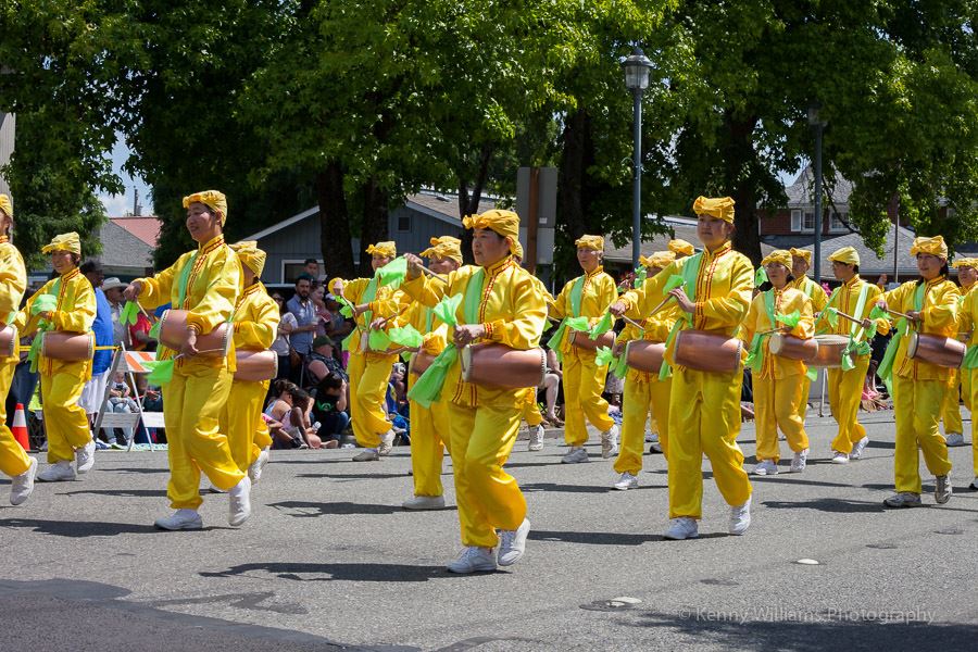 法轮功学员的队伍由法轮大法横幅开道,紧随其后的是由身穿金色衣服的法轮功学员组成的腰鼓唐鼓队和法船花车,最后是“真善忍”横幅。队伍所经之处均受到两旁观众的欢迎,成片的观众鼓掌并喝彩。