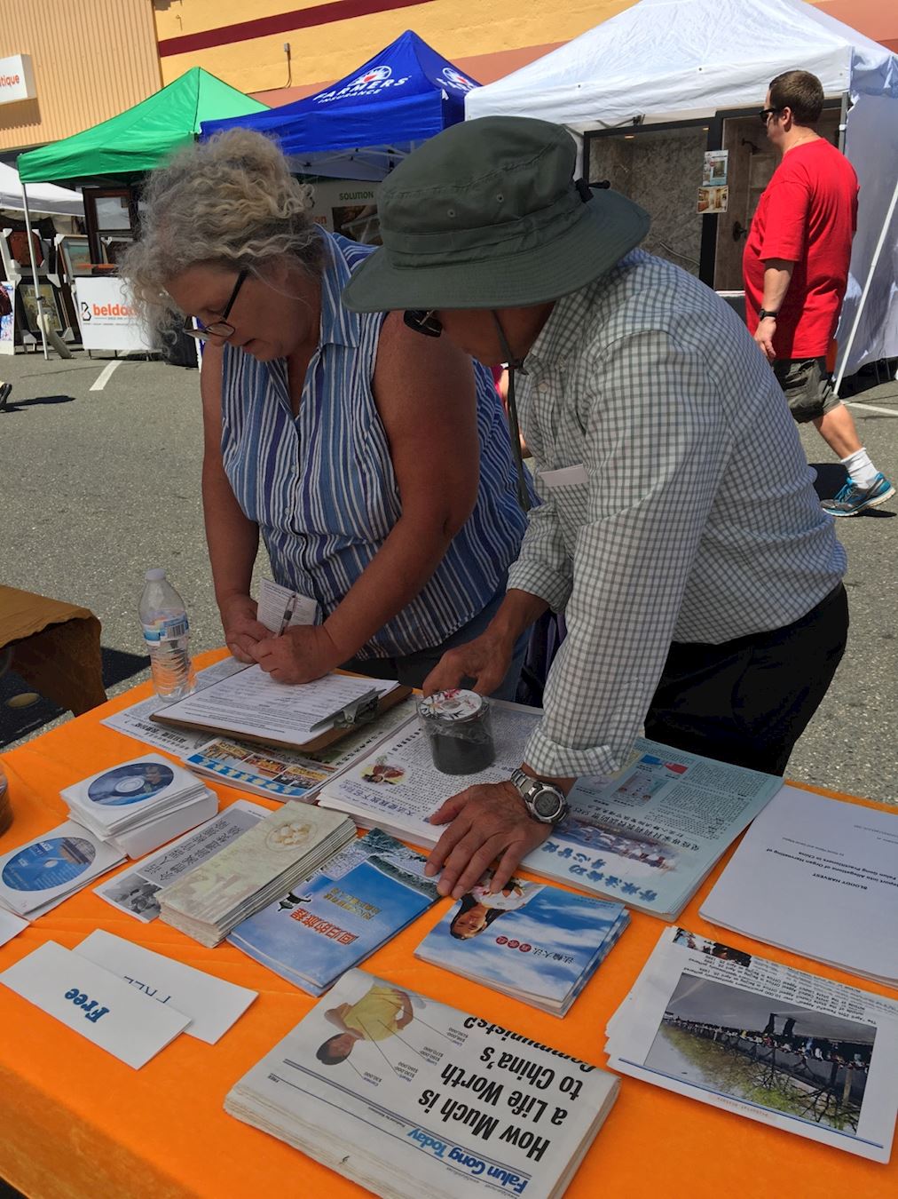 在三天活动中,许多民众来到摊位前与法轮功学员交谈。一位带着儿子的中年男子走到摊位前,当听到中共活摘贩卖法轮功学员器官时非常震惊,他说:“这令人发指(beyond disgusting)!我曾经读过关于活摘的恐怖故事,但那时我以为那些就仅仅是恐怖故事而已,不可能是真实存在,且在当今还发生着。回家后我一定会上网搜索更多关于法轮功的信息。”