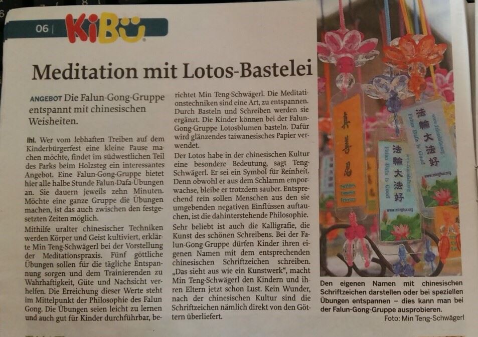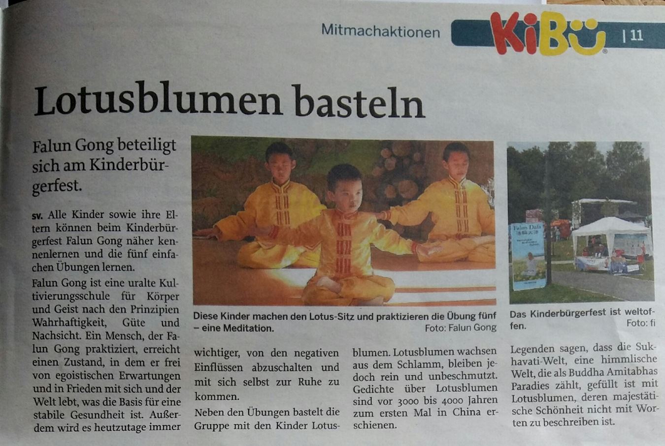 法轮功团体去年第一次受邀参加了德国巴伐利亚中部地区报社 (MittelbayerischeZeitung)举办的儿童节,简单的炼功动作、深奥的修炼文化,广受儿童和家长的喜爱。今年夏天报社热情邀请法轮功团体再次参加活动,让更多人了解法轮功。