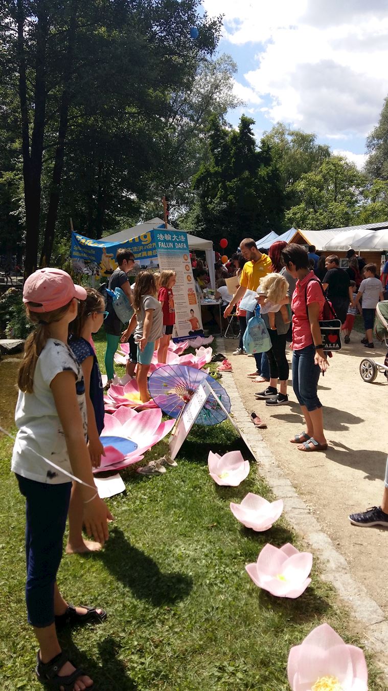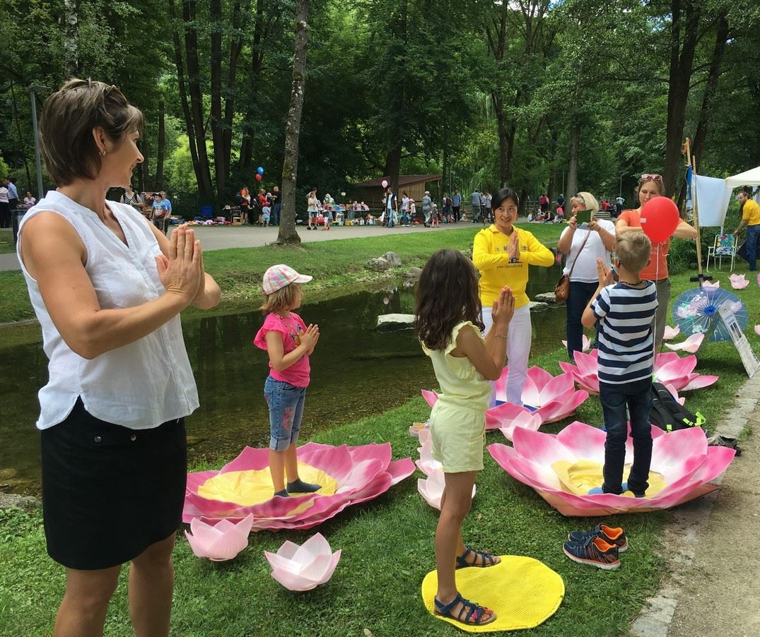 二零一七年七月二日以及七月十六日,法轮功团体参与了在卡姆市(Cham)的休闲公园和巴德·阿巴赫市(Bad Abbach)的疗养公园举办的儿童节。美丽圣洁的莲花、安静祥和 的音乐吸引了众多儿童和家长,法轮功学员向大家介绍法轮功,通过让他们学功, 亲身体验学炼法轮功的良好感受,使他们对法轮功有了最直观的认识。