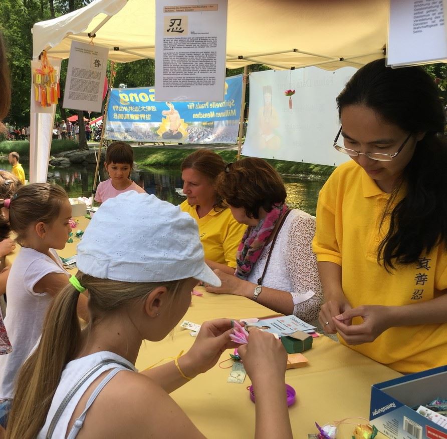 除了教功外,法轮功学员还教孩子写真、善、忍三个字,告诉他们这是法轮功教的做人的道理,并给孩子在印着“什么是法轮功”的书签背面写上他们的中文名字。平常他们接触到的都是字母,看到自己的名字竟然能用中文字写出来,自己还能学着写中文字,都感到非常惊喜。有耐心的孩子还学会了折小莲花,边折边听法轮功学员介绍,莲花的美丽在于其出淤泥而不染的圣洁风骨,而挂在小莲花上的精美书签,则用中文和德语写 着“法轮大法好”和“真、善、忍”。明白了小莲花代表纯正,了解到法轮大法的美好,孩子们高兴极了,对小莲花更加爱不释手。
