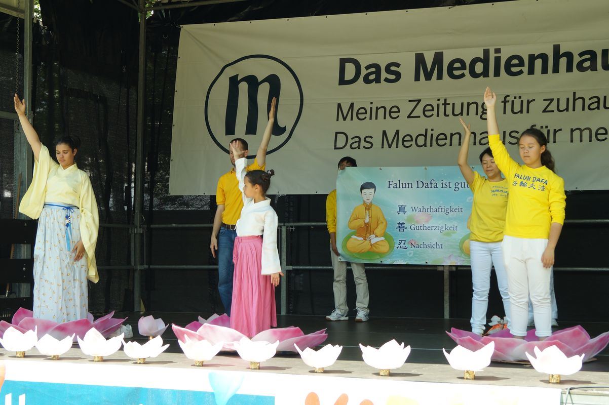 法轮功学员们还参加了舞台上的功法表演,详细深入的介绍法轮功教人按照宇宙特性真、善、忍做好人和祛病健身的效果,并揭露在中国发生的迫害。当观众了解到在中国被中共禁止和迫害,法轮功修炼者被逮捕、被酷刑折磨,甚至被活体摘取器官而致死,都感到不可思议。法轮功学员也告诉观众,善良终将战胜邪恶,法轮功洪传世界各地,已经有越来越多的人明白了真相,这时现场观众鼓掌表示支持。