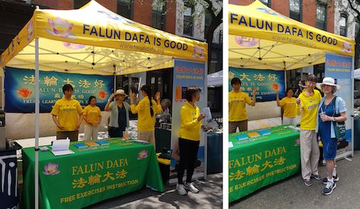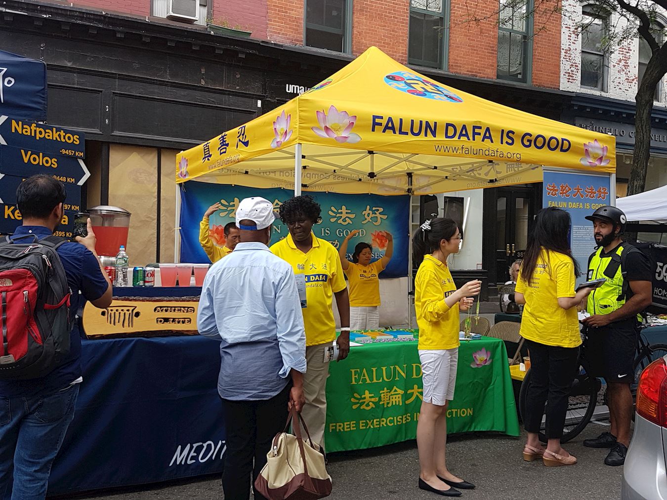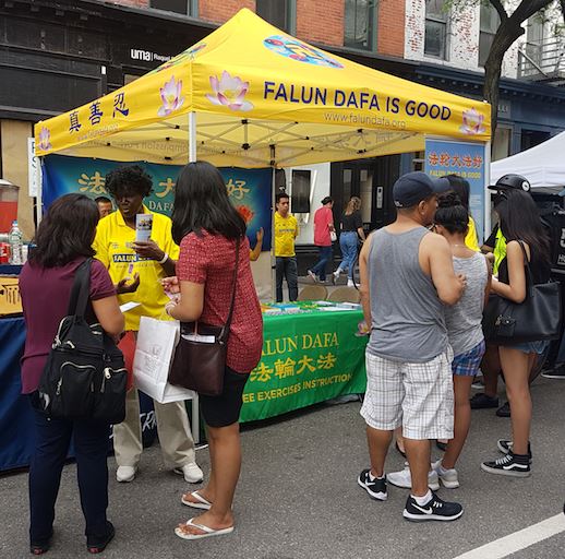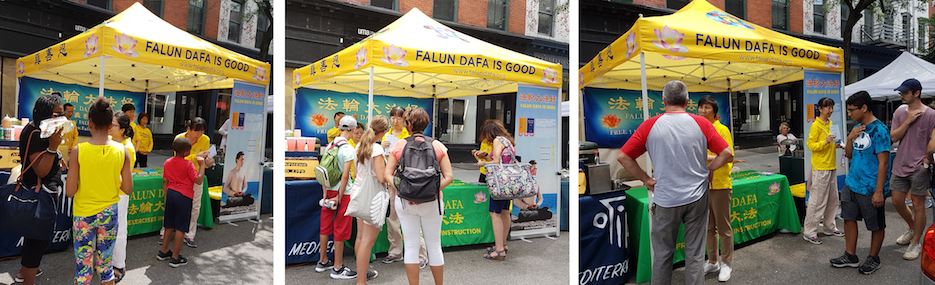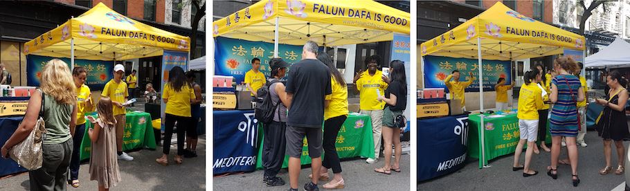 大家纷纷赞同“真善忍”和“做好人”的普世价值,一位老先生以前听说过法轮功在中国被迫害,赞扬法轮功学员坚持说真话和不放弃的坚韧精神;有的说,“打坐,这正是我需要的”;一位男士看到小弟子们打坐时非常安静祥和为之感动,拿了资料要回去学功;一位来自南卡莱罗纳的女士了解到修炼法轮功的益处后,向学员拿了很多资料要跟亲朋好友及同事分享;有来自外国的游客也要回到自己的国家找学员学功,纽约客在了解到家附近的炼功点信息后也要去学功。
