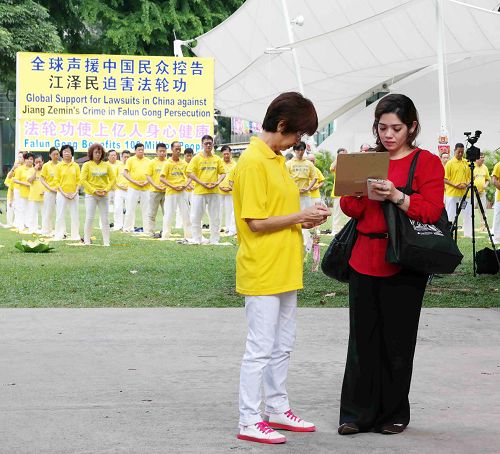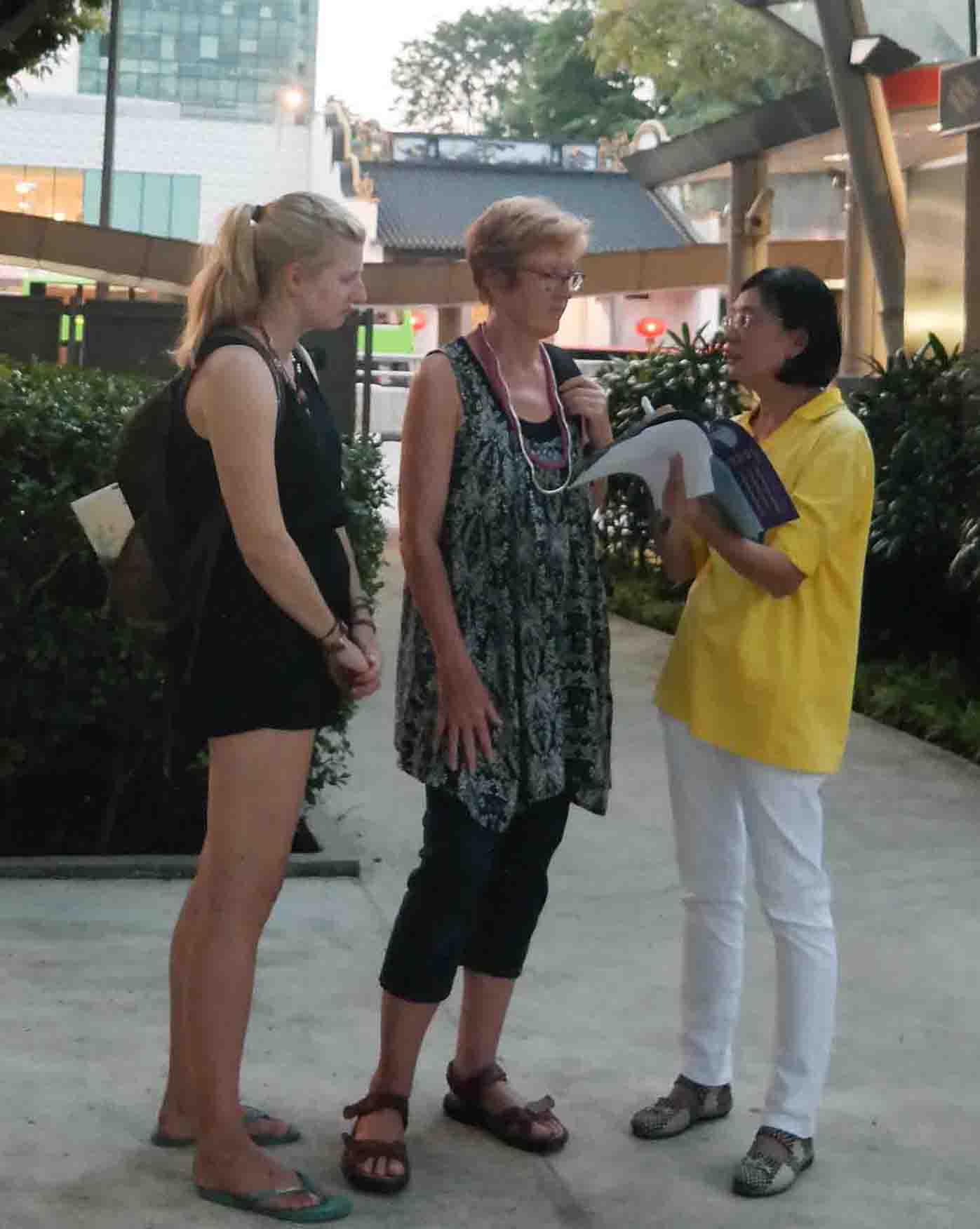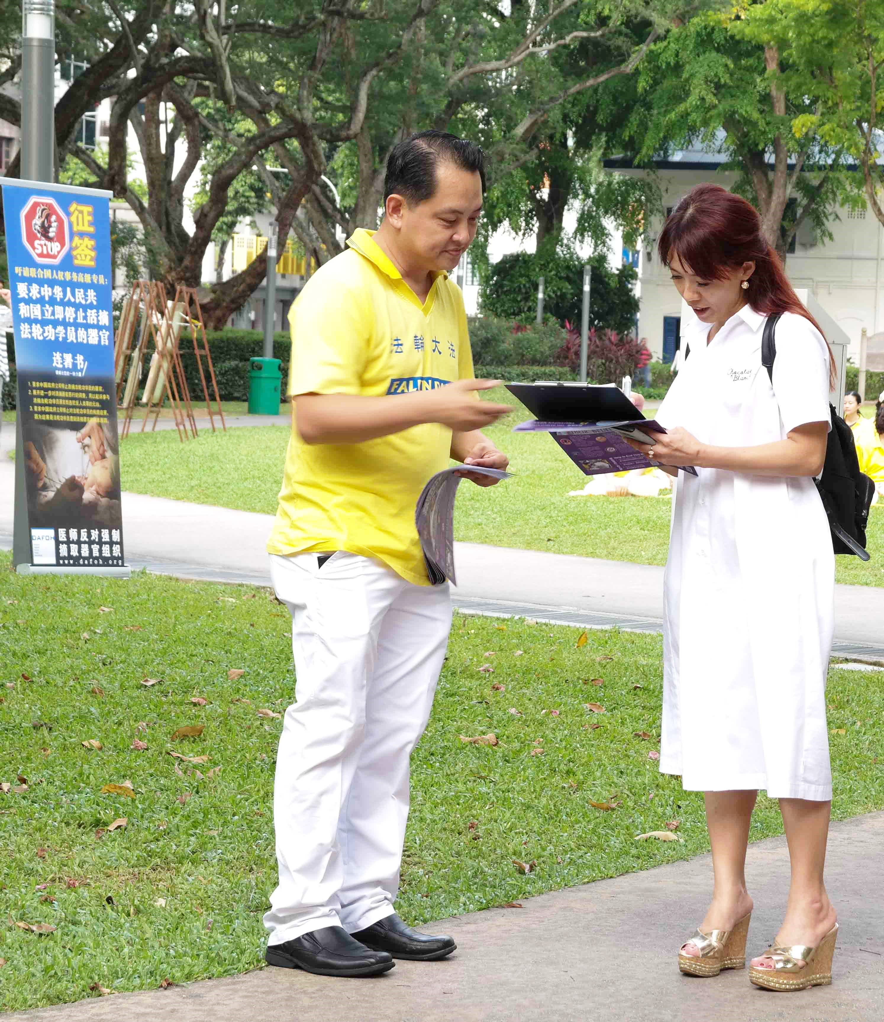 清秀端庄的张小姐是新加坡人,在聆听了学员讲述的迫害真相后,她表示愿意签名尽一份力。她说:“第一次听说迫害的事情,挺意外的,为什么会有这样的事情发生呢?我也是有信仰的人,人们因为信仰而被迫害,这是不能被接受的。”“愿意出一份力,希望可以帮助那些遭受迫害的人。”“共产党散播恶意的谣言,澄清误解是必要的。”