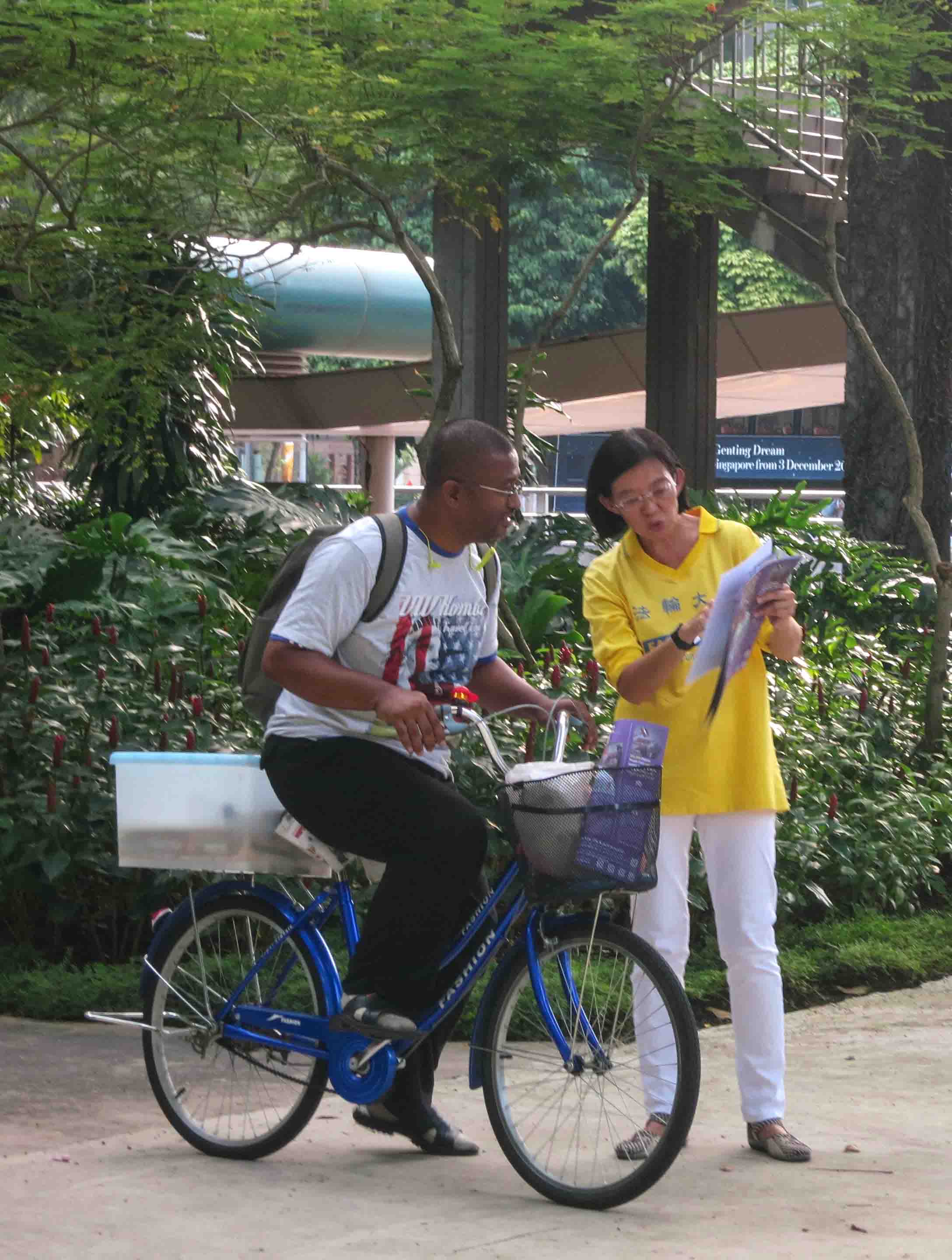 他说:“所有能接触的人都知道我炼法轮功,我把他们都当作亲人,耐心地告诉他们真相。多年来,我和一些同修跑遍了整个新加坡,从闹市街头、组屋小巷到工厂工地,刮风下雨都没有退缩过。明白真相的新加坡人说,法轮功做得好;经过我们讲真相,退出中共组织的中国人也不计其数。”