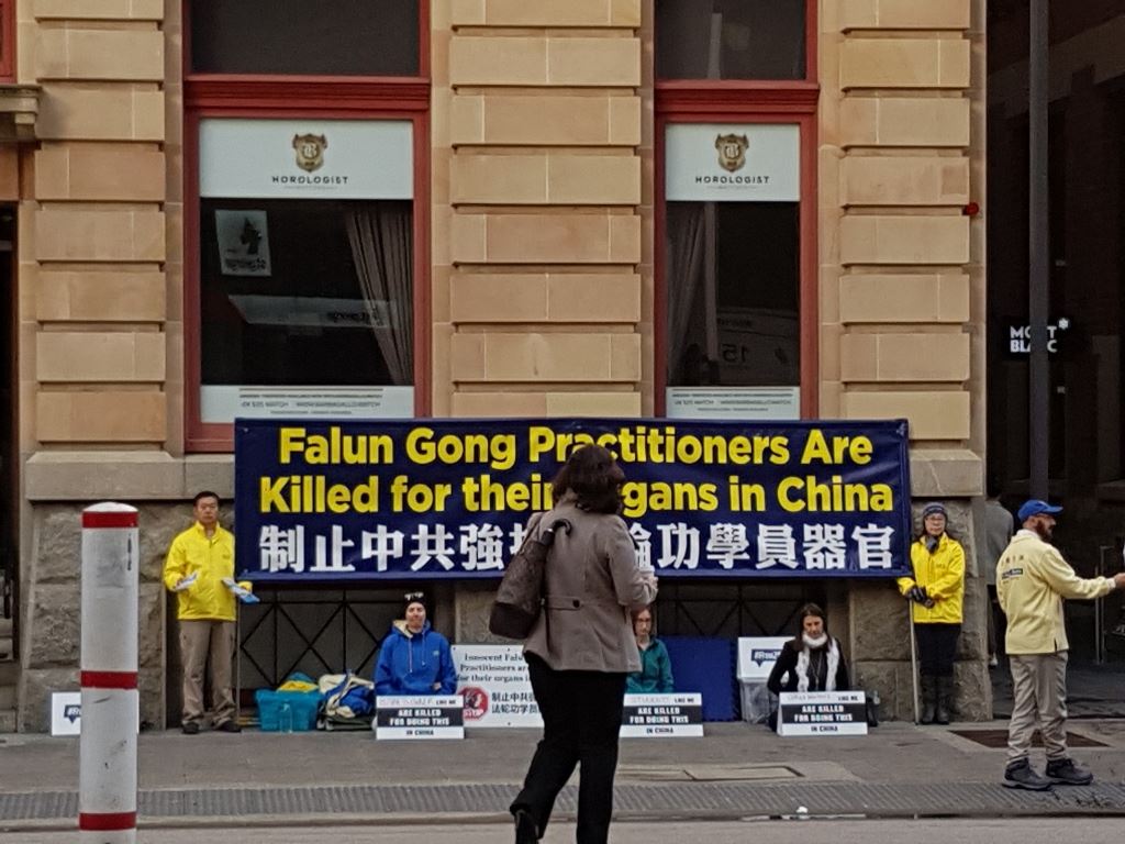 蒙特利尔中领馆位于市中心繁华商业区的Ste-Catherine大街上。在集会活动过程中,有不少本地居民和游客了解到发生在中国的这场迫害。从约旦来蒙特利尔短期旅游的Issac Rodi 夫妇,非常认真地聆听了法轮功学员讲述的中共对法轮功的迫害,他们发自肺腑地谴责中共虐杀无辜法轮功学员的行为,并表达了对法轮功学员的支持。