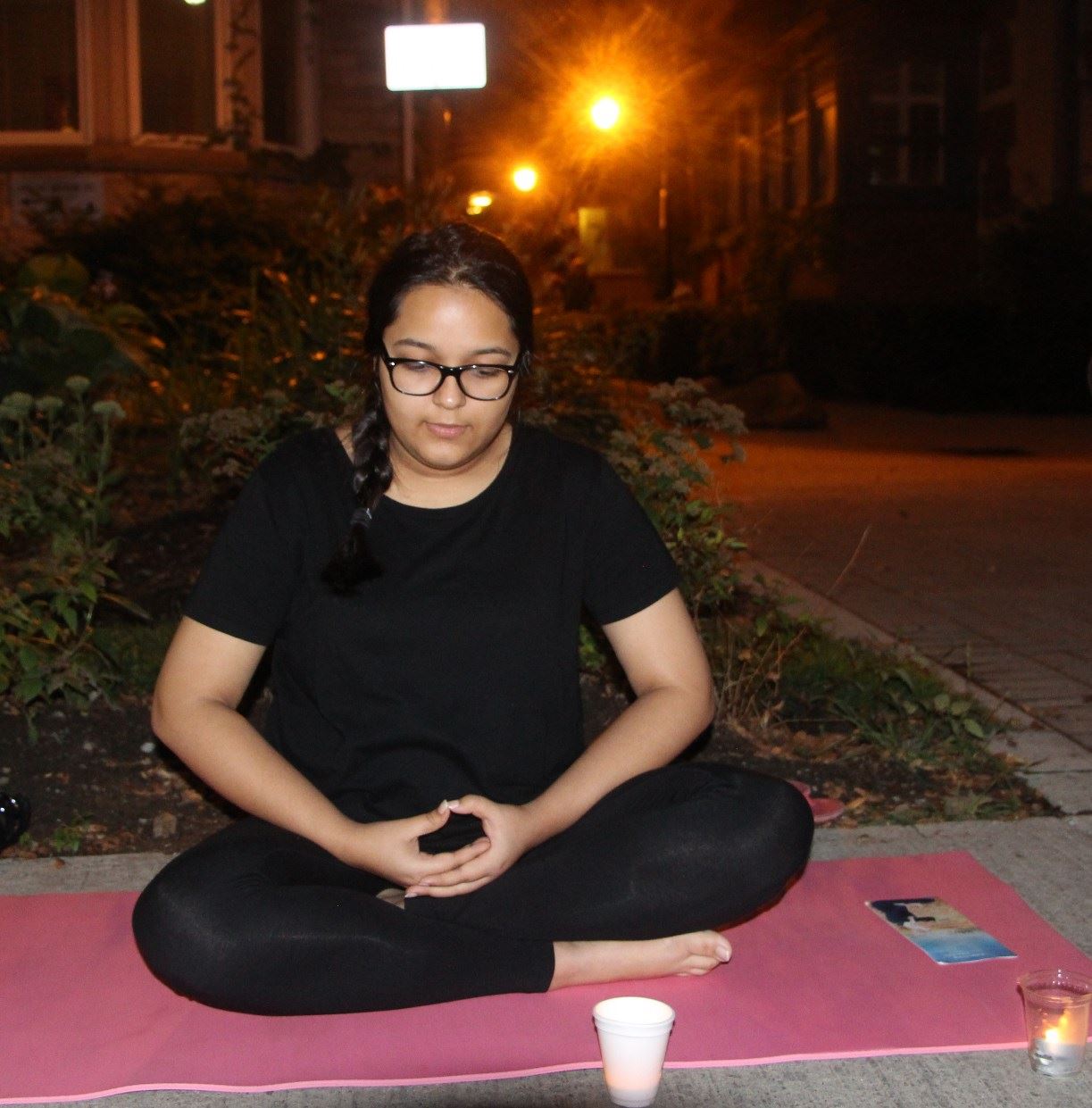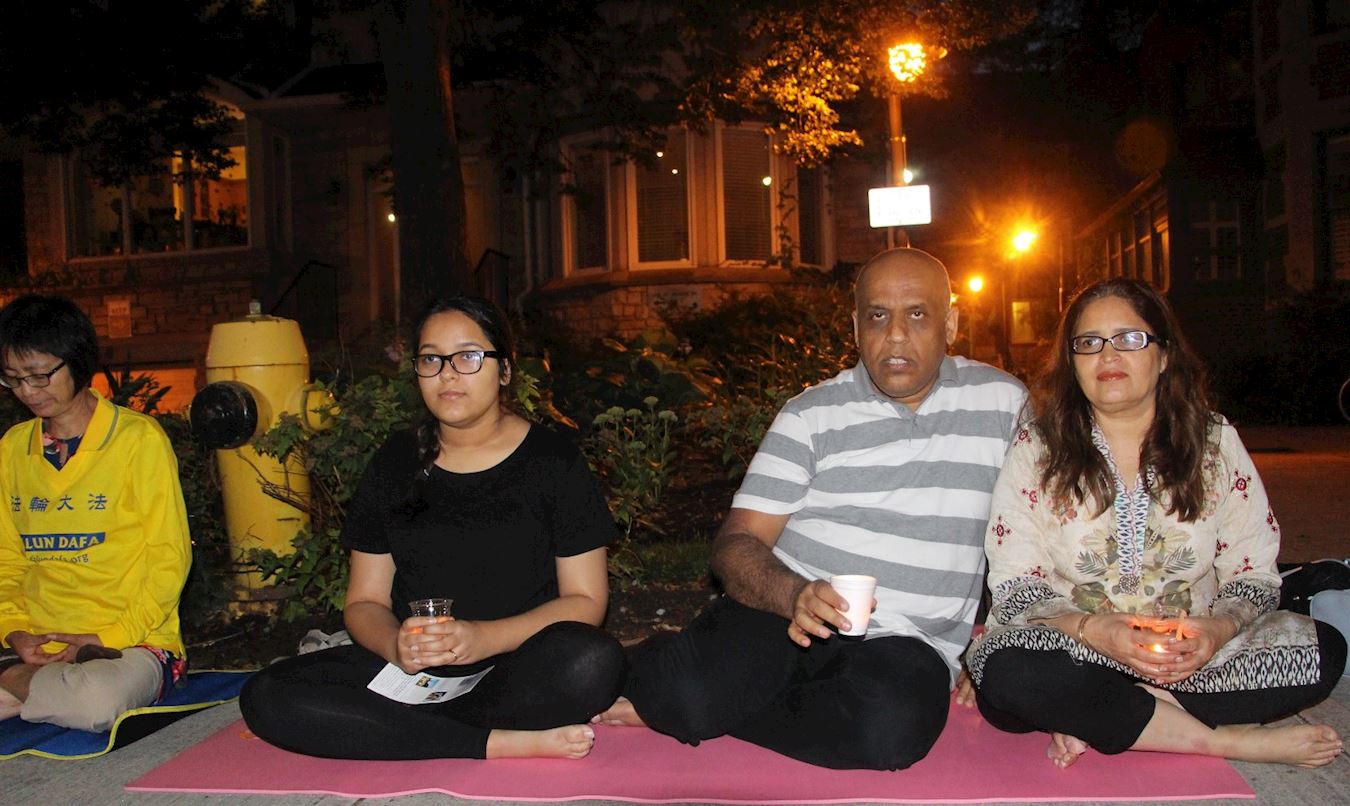 巴基斯坦新移民Ravi一家刚好今天搬到活动地点的附近,他说:“前段时间一天经过中领馆门前,我接到了一张有关法轮功的传单,我知道了这个团体在中国是被残酷迫害的,还被活摘器官。今天我们刚搬到这来,我的女儿Chanchal看到这么多人,这么肃穆的场面,她一定要出来参与到他们中去,所以我们就和她跟法轮功学员坐在一起,参加今晚的悼念活动。”