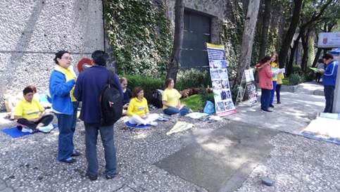 当天,法轮功学员在中共使馆前炼功,派发真相资料,并征集人们在反对中共活摘器官的请愿信上签名。