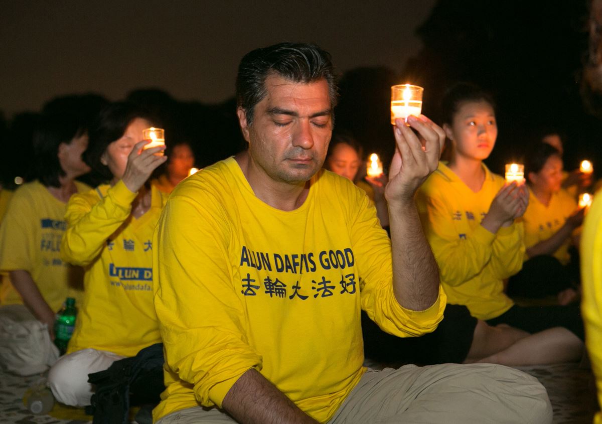 来自台湾的游客谢先生说,他已经把拍摄的烛光夜悼图片传给了在台湾的学生看。他说,他的学生也炼法轮功,这个场景很特别,没想到刚好碰到。