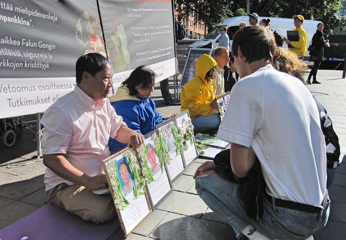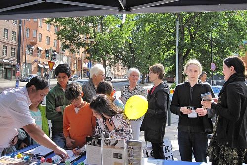 两位学生驻足和细看遗像前的资料。当他们了解到十八年来中共对法轮功群体的无辜迫害和活摘器官真相的暴行后,非常震惊。其中迈克尔(Mikael)先生表示,通过在这里了解真相的过程,感受到和你们交谈非常舒服。这么多善良的人遭到迫害,中共政府竟然作出如此可怕的事,这是无法容忍的,它必须马上停止。