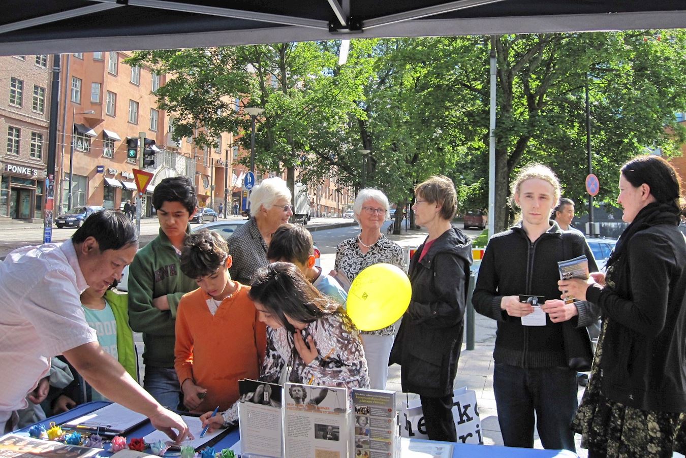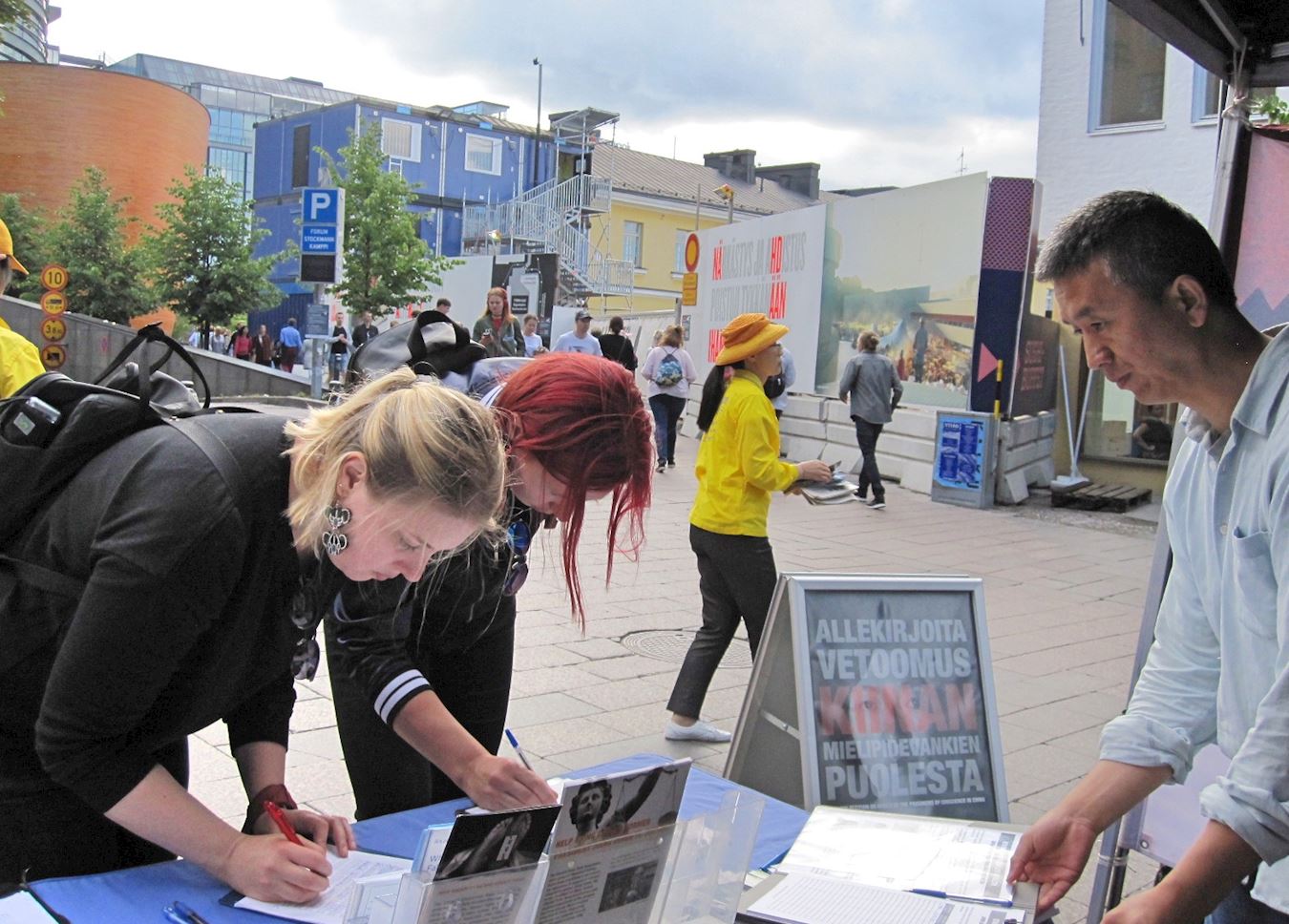 '图3~7:当天下午,芬兰学员又来首都市中心向当地民众和游客介绍法轮功的真相。不少民众驻足了解,并签名支持制止迫害。'