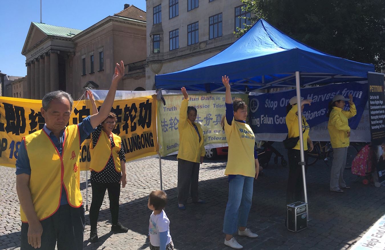 哥本哈根新广场和步行街相连,来往的民众很多,法轮功学员架起帐篷挂起横幅,随着优美的炼功音乐展示五套功法,吸引众多路人驻足观看。不少学员给民众发资料和向民众讲述法轮大法的美好。修炼法轮功给修炼者带来身体的健康,道德回升,但是在中国却遭到残酷的迫害,更为惨烈的是,活摘法轮功学员器官的滔天罪行。