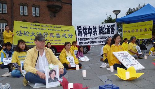![]() 图3~4:法轮功学员在哥本哈根市政厅广场举办烛光悼念 |