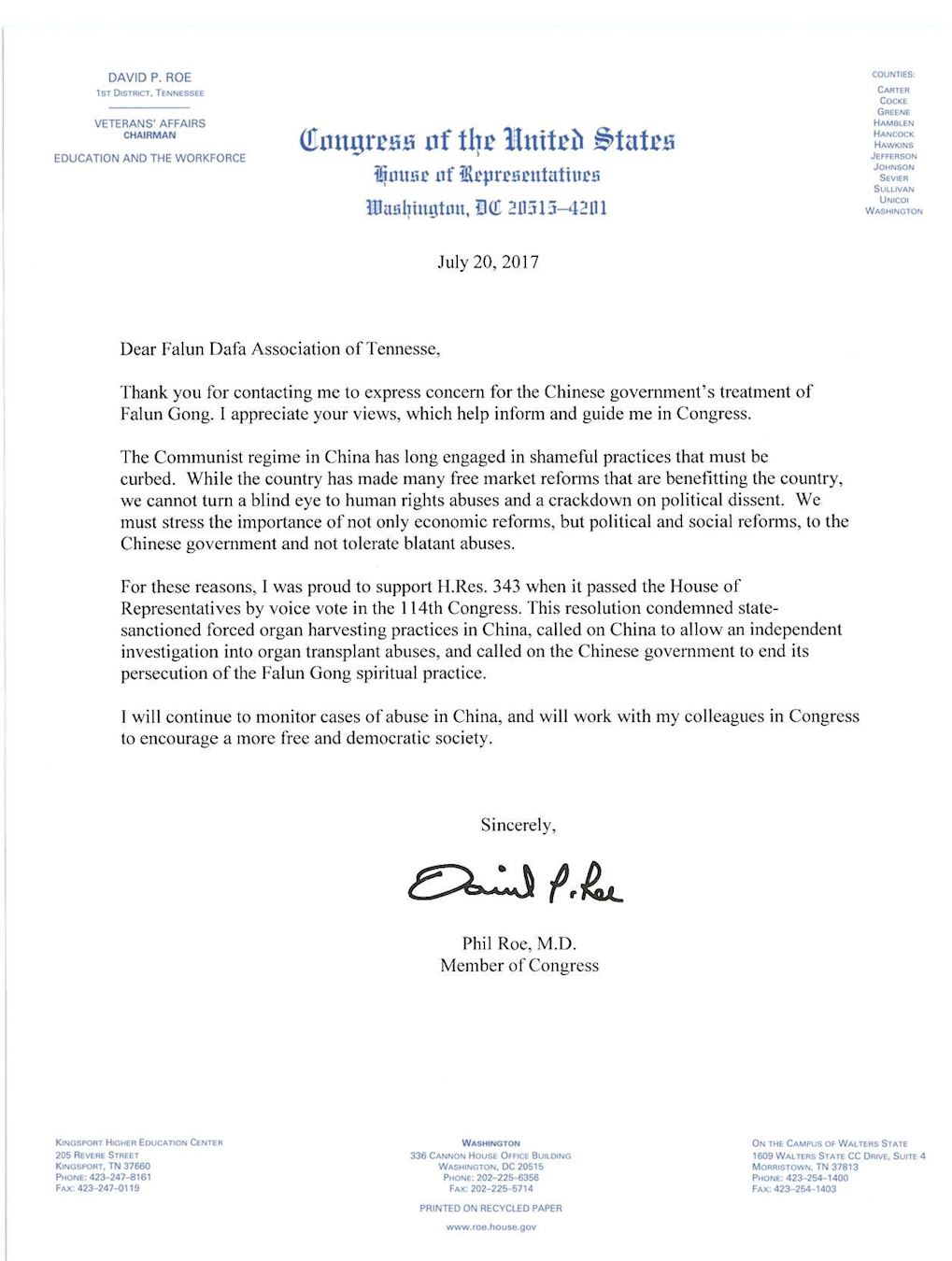 田纳西州国会议员菲尔·罗(Phil Roe)表示,“中共政权长期以来令人不齿的行径必须被制止。”罗议员支持了去年在美国国会众议院通过的343决议案。他说:“我会继续关注发生在中国的暴行,并且会和国会同仁一起,致力于创建一个更为自由和民主的社会。”