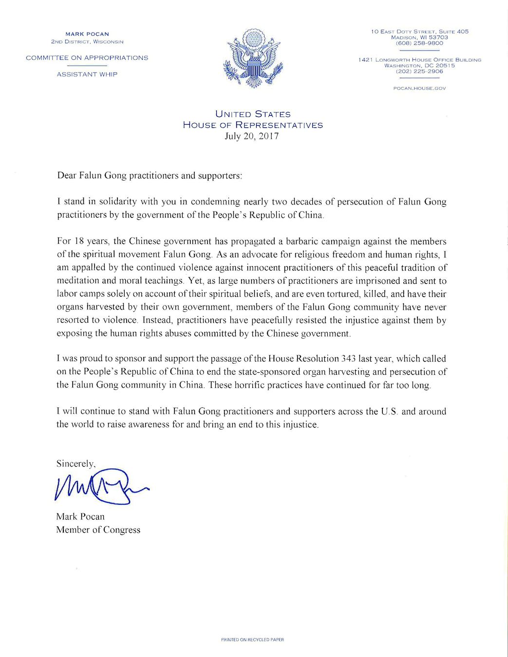 威斯康辛州国会众议员马克·波肯(Mark Pocan)表示,作为宗教自由和人权的支持者,针对平和的法轮功学员的暴力镇压让他震惊。他在信中写道:“大量的法轮功学员仅仅因为他们的精神信仰,被送到劳教所或被关押。但即使面对这样的不公,法轮功学员从没有以暴制暴,而是通过曝光中共犯下的人权罪行来制止迫害。”
