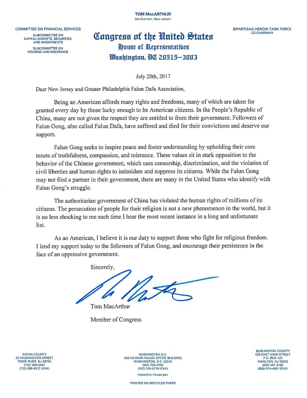 新泽西州国会众议员汤姆·麦克阿瑟(Tom MacArthur)认为,作为美国人,他们享有众多权利和自由,更有义务支持寻求信仰自由的人们。麦克阿瑟在信中写道:“法轮功的法理注重真、善、忍,并以此寻求平和与理解。中共的行为则大相径庭,中共通过审查、歧视分化、侵犯公民自由和人权的方式恐吓和镇压民众。”