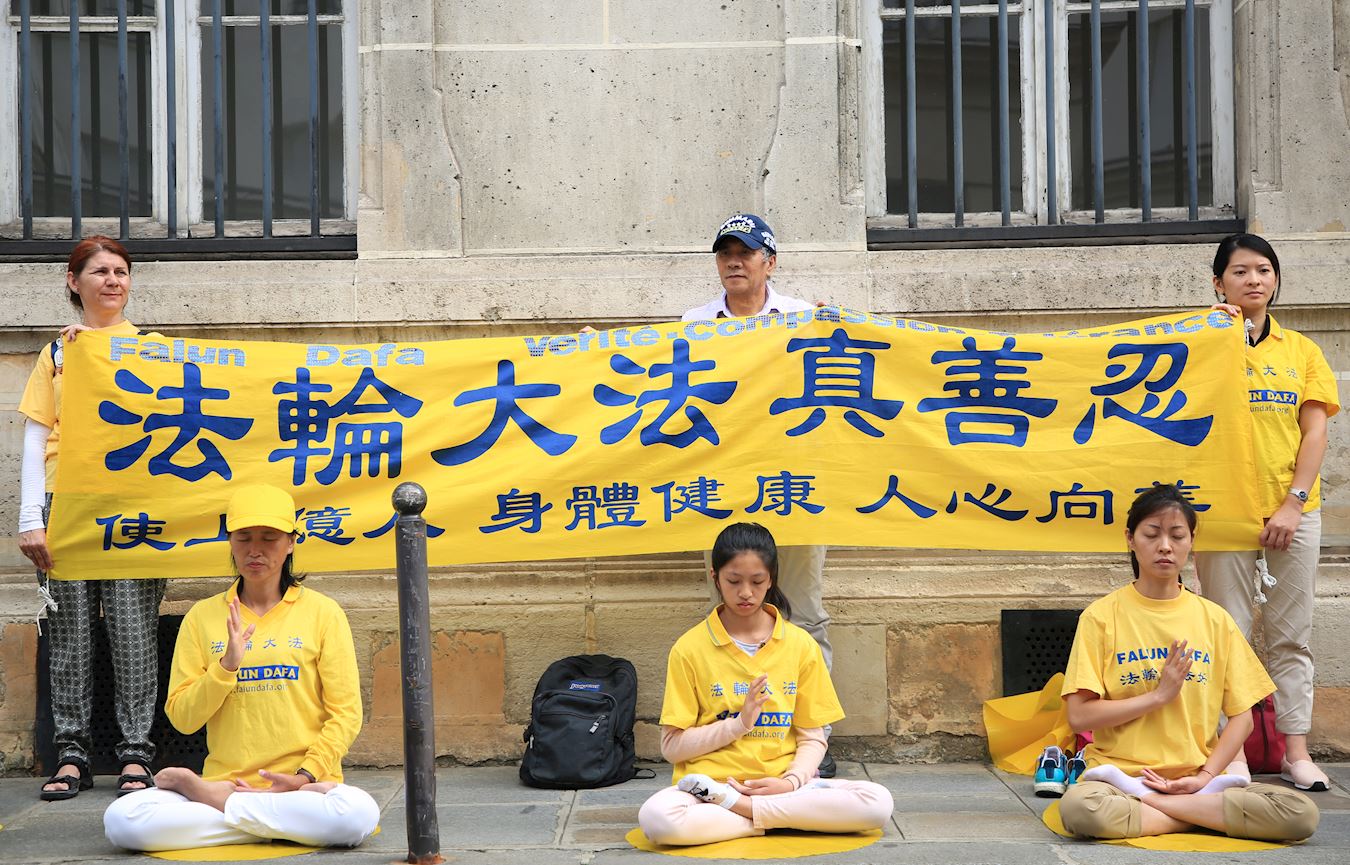 '图1~3:二零一七年七月二十日下午,法轮功学员在巴黎中使馆前集会,抗议中共对法轮功长达十八年的迫害'