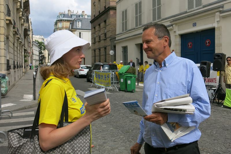 图4:二零一七年七月二十日下午,法轮功学员在巴黎中使馆前集会时,学员向过往行人讲真相