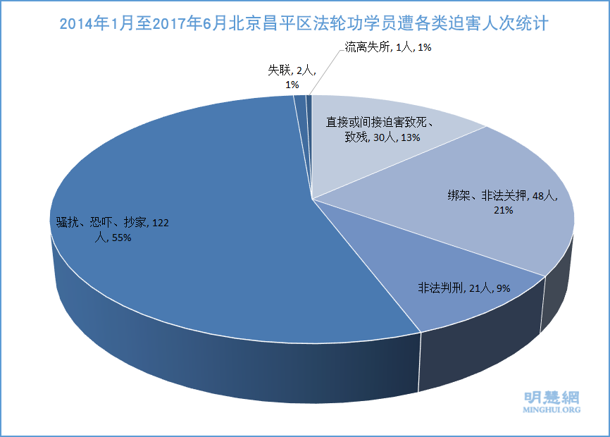 ![]() 图2:2014年1月至2017年6月北京昌平区法轮功学员遭各类迫害人次统计 |