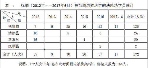 二零一四年六月二十日,在抚顺市公安局统一指挥的“6.20”有预谋地绑架案中,非法抓捕抚顺市区内十七名法轮功学员,并实施抄家、抢劫。