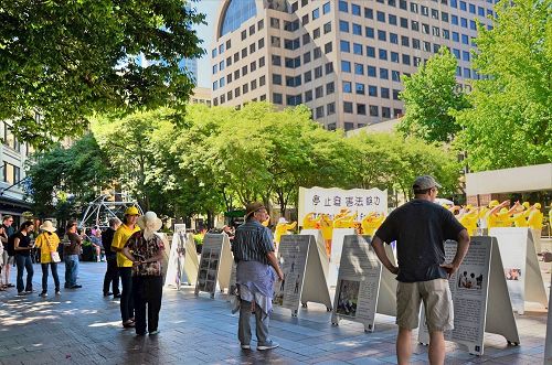 活动当天,金色阳光下,几十位身穿黄色的写有法轮大法和真善忍字样的T恤的中西方法轮功学员在祥和的炼功音乐下展示法轮功五套功法。许多人们看到学员整齐的功法演示说:“这真吸引人!(It’s fascinating)”“太美了!”随后向周围的法轮功学员索要传单。在四个小时的活动中,近三百名不同族裔不同年龄的民众在反活摘征签板上签名,了解了法轮功受迫害真相及中共活摘器官的恶行。