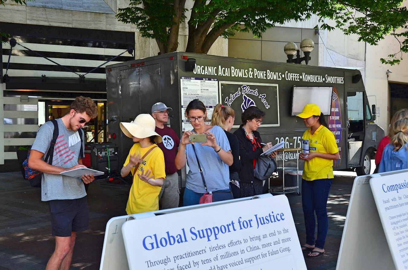 '图1~3:反迫害十八周年,大西雅图地区的学员在西雅图市西湖公园(Westlake Park)传播法轮功的真相,吸引路人驻足了解,并签名支持反迫害。'