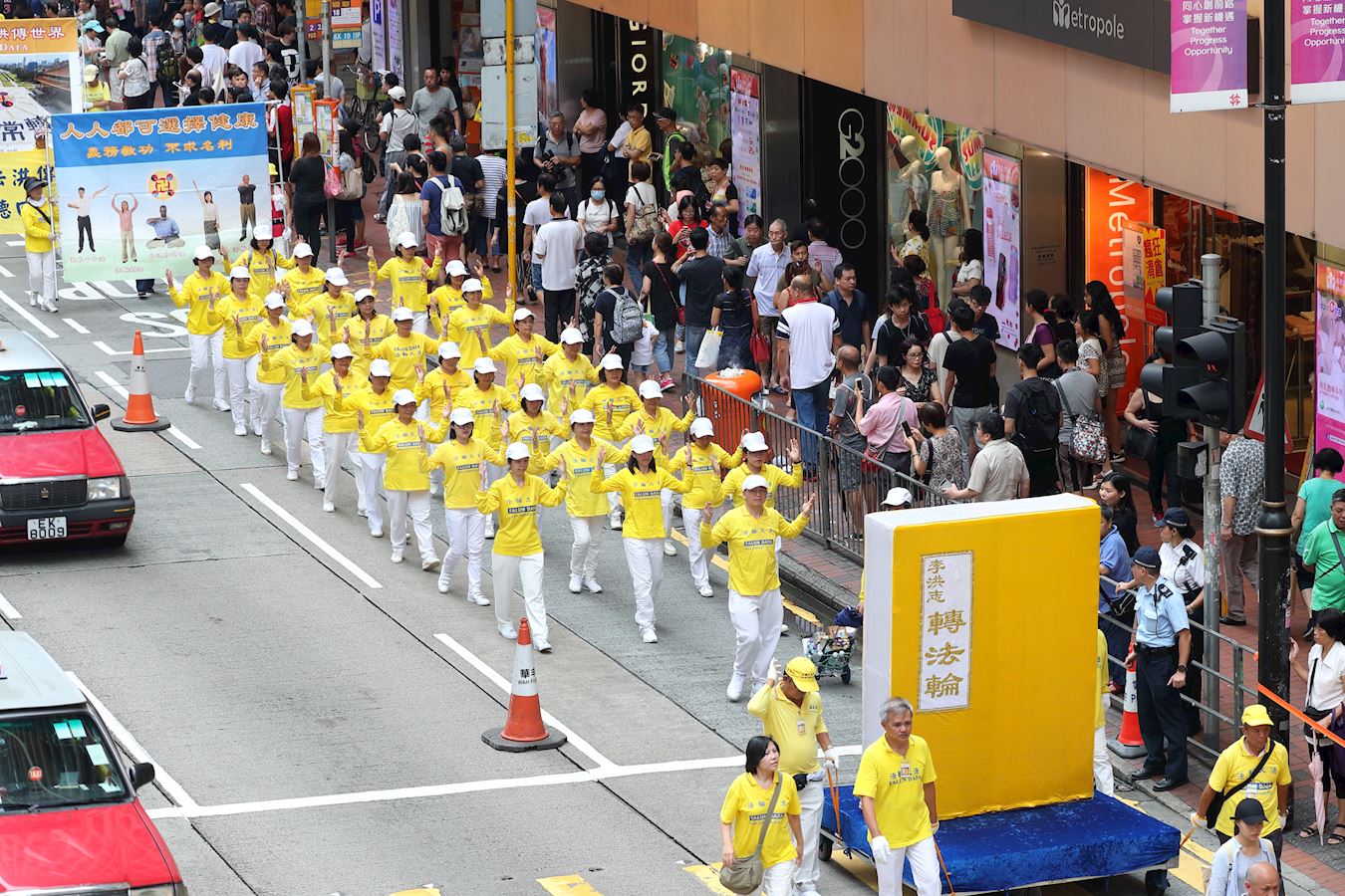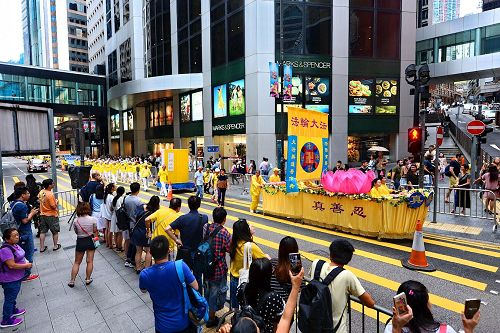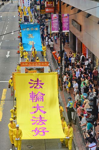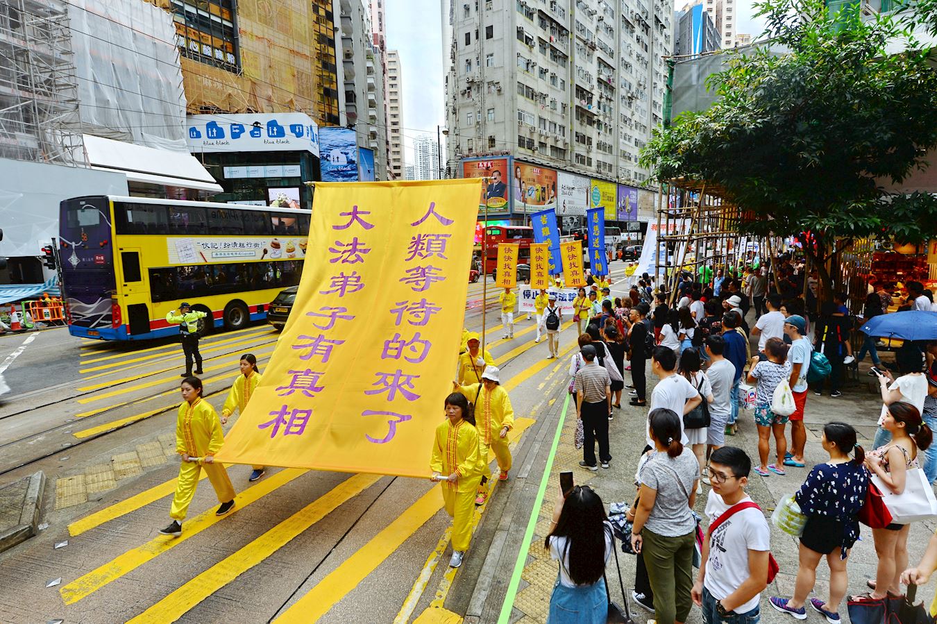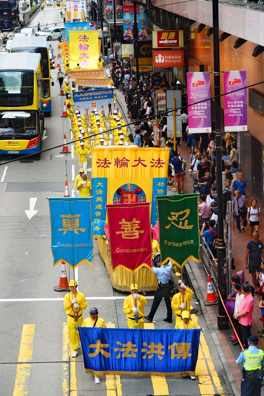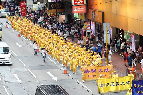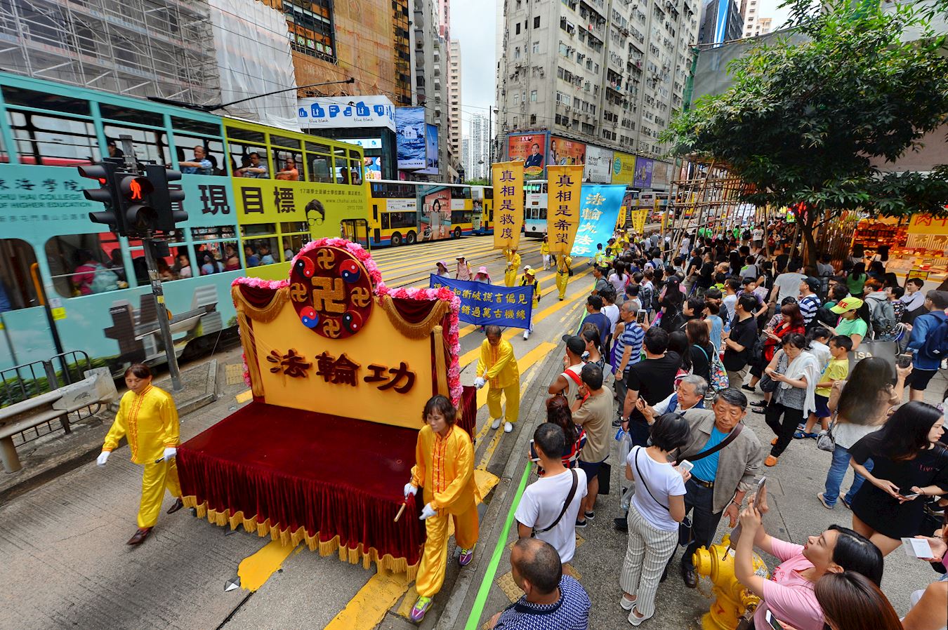 游行队伍在天国乐团引领下,从北角码头起步,途经铜锣湾、湾仔、中环等闹市区,游行至中联办,吸引众多市民和游客观看。不少第一次来港的大陆游客看到法轮功学员游行,深受震撼。
